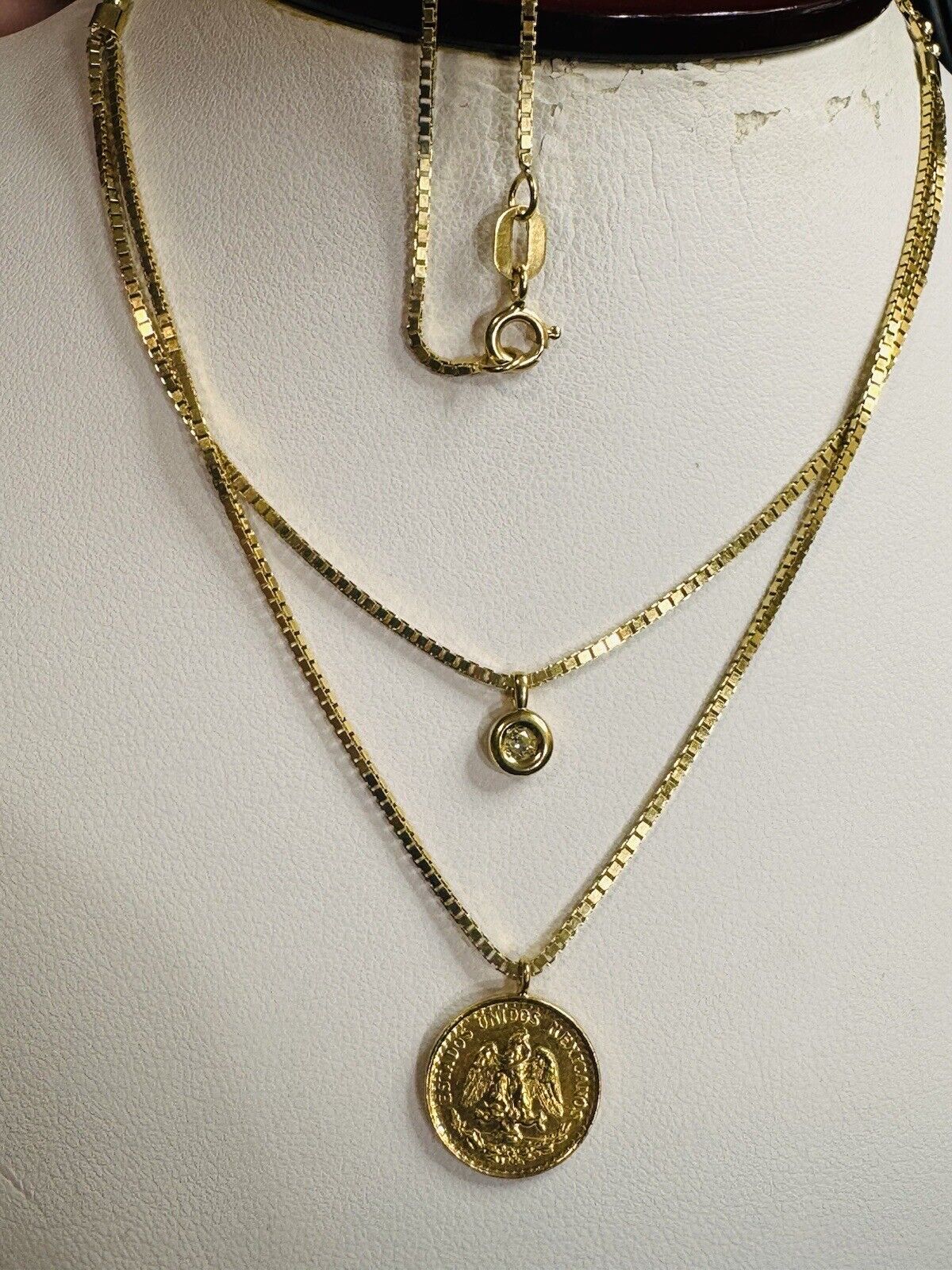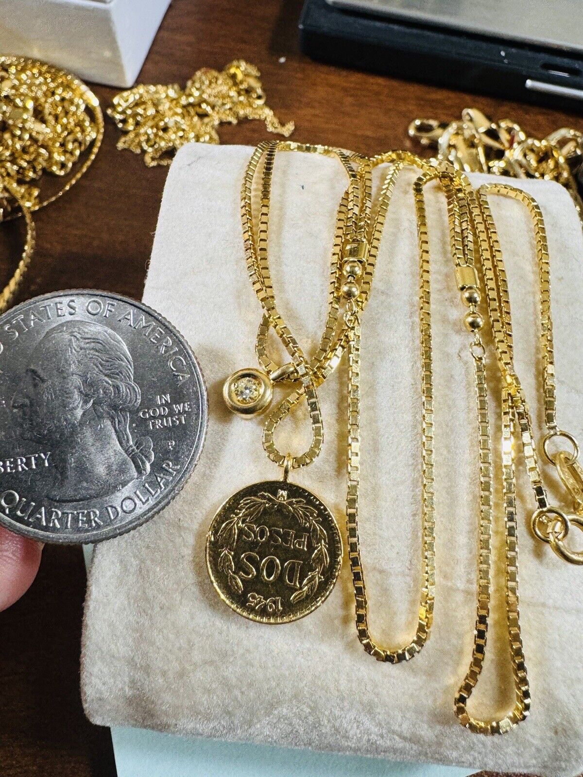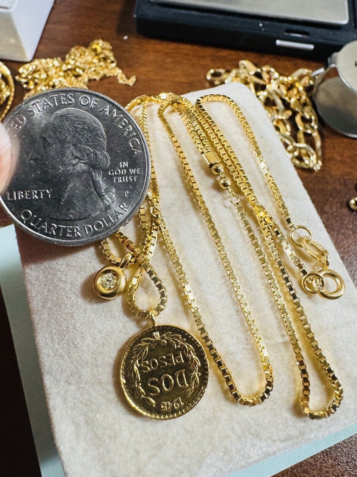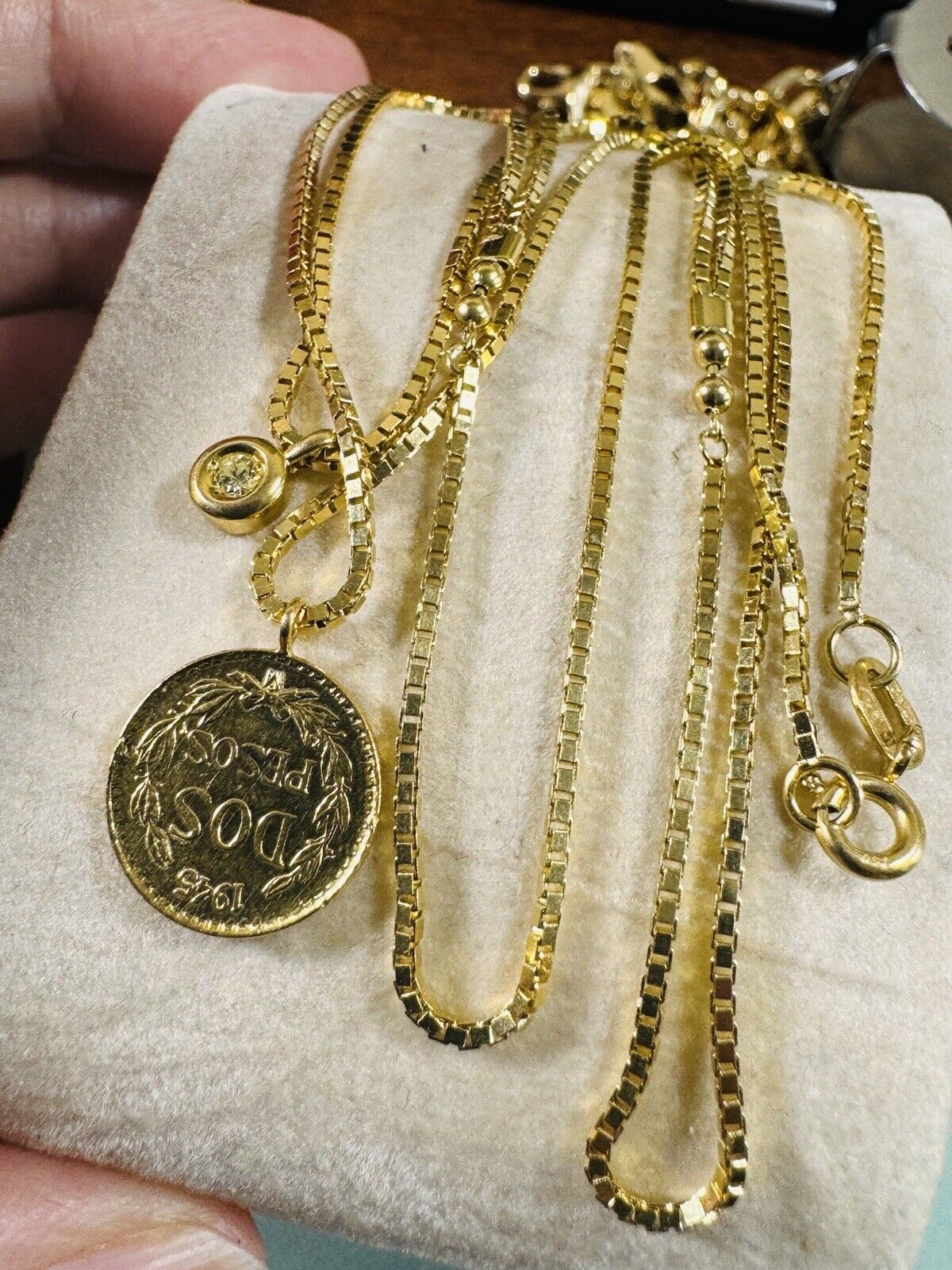 18K 750 Fine Yellow Gold Dos Pesos Coin Necklace 18” /19” Long 9.3g