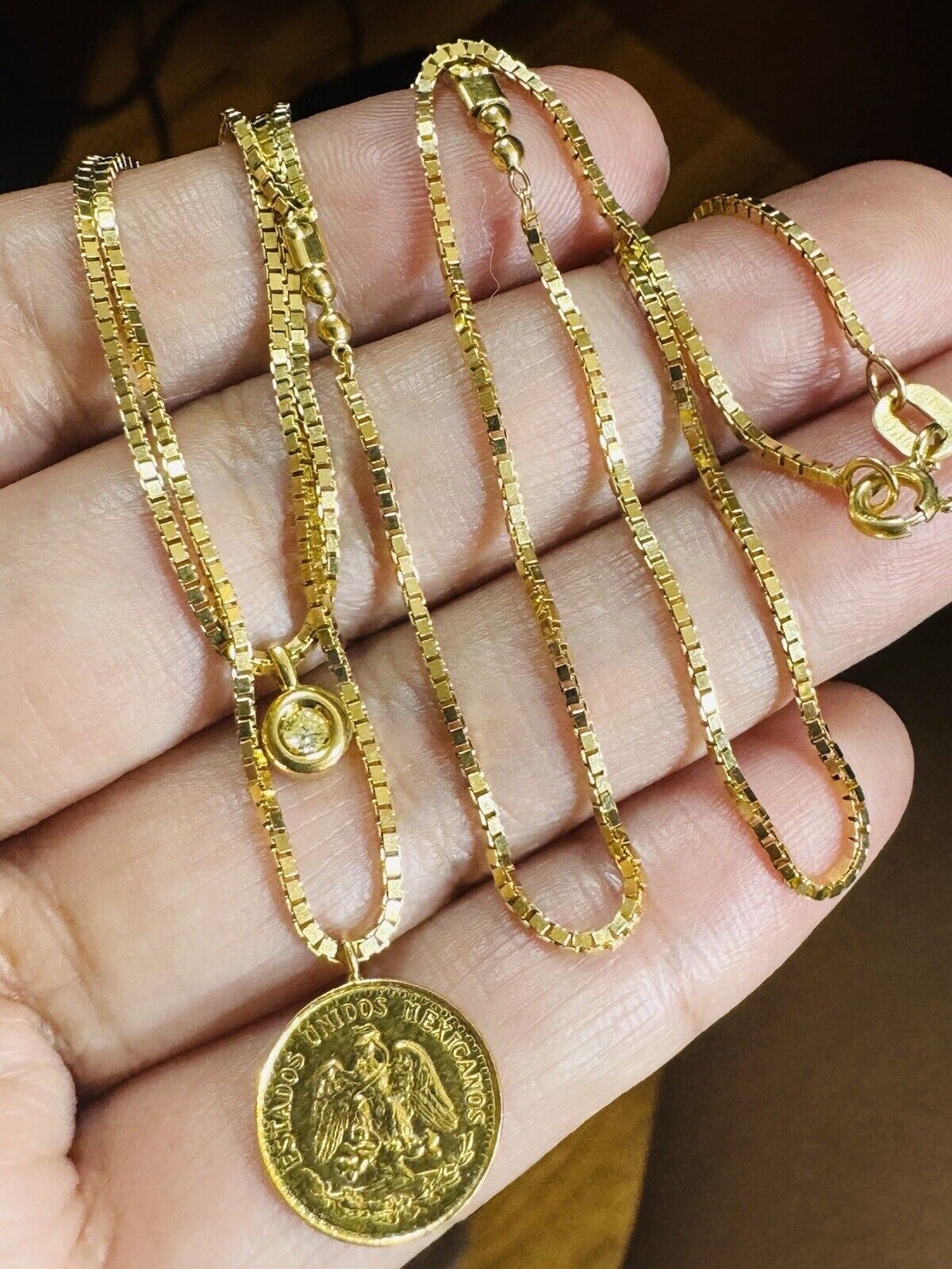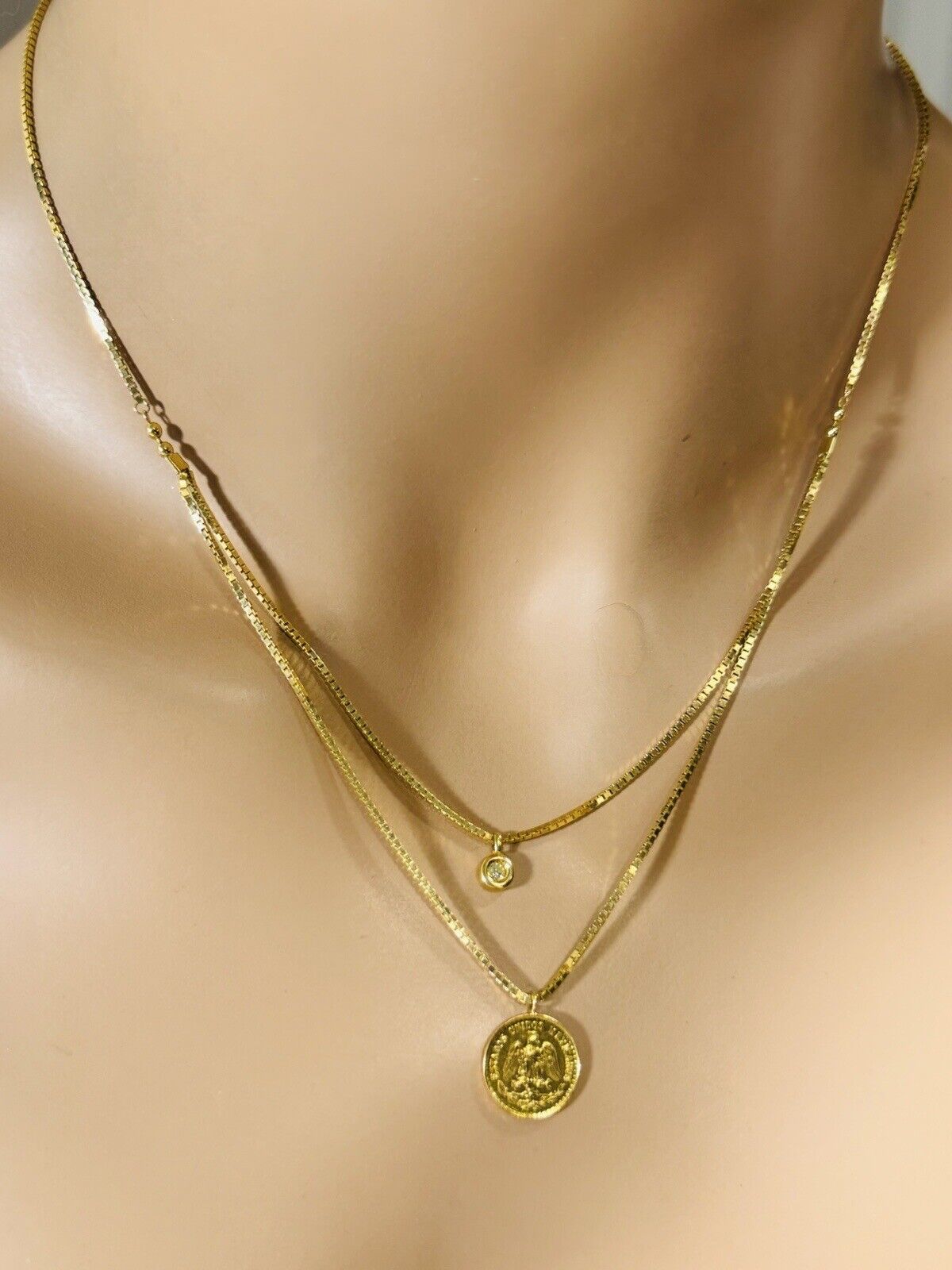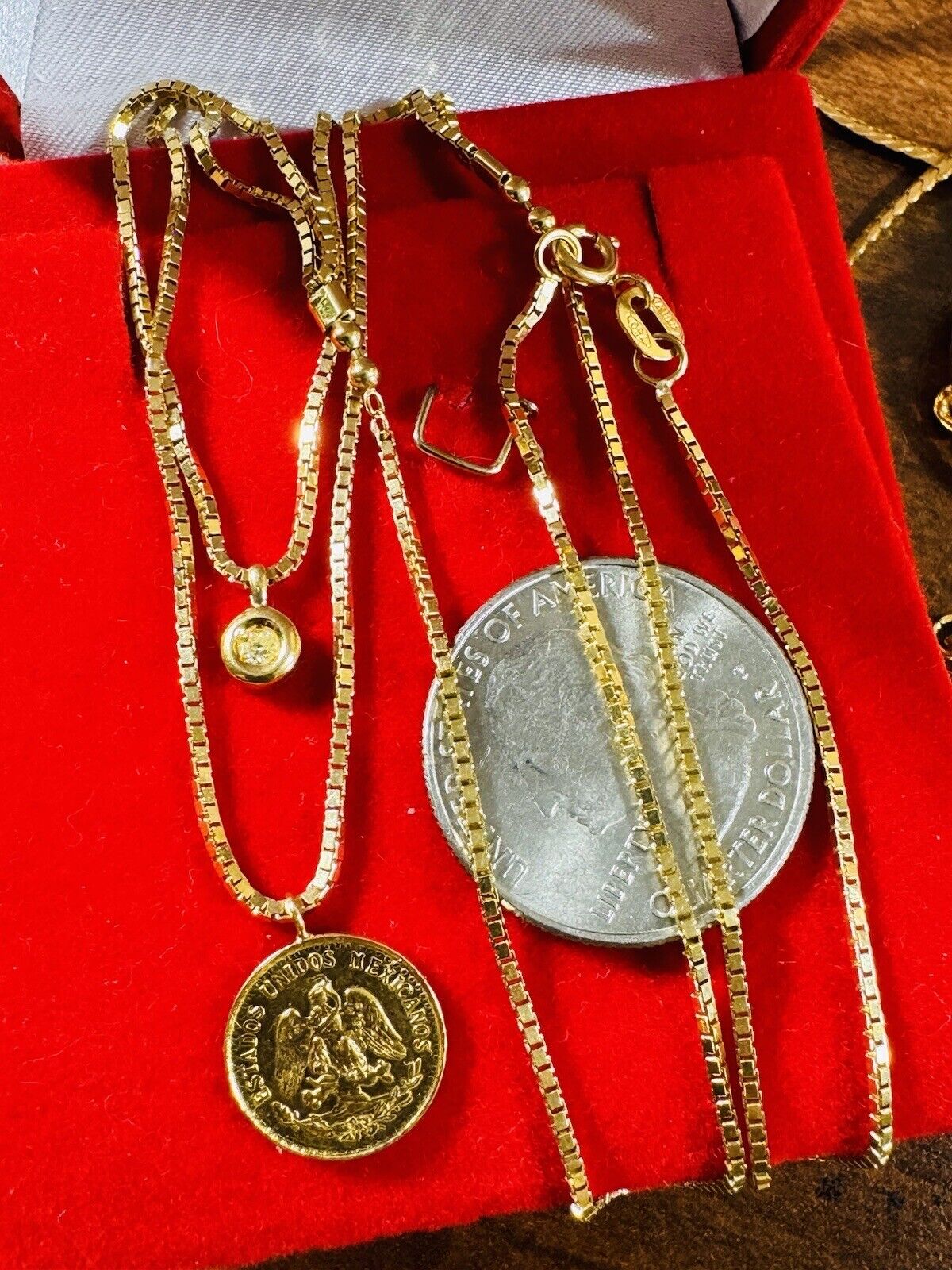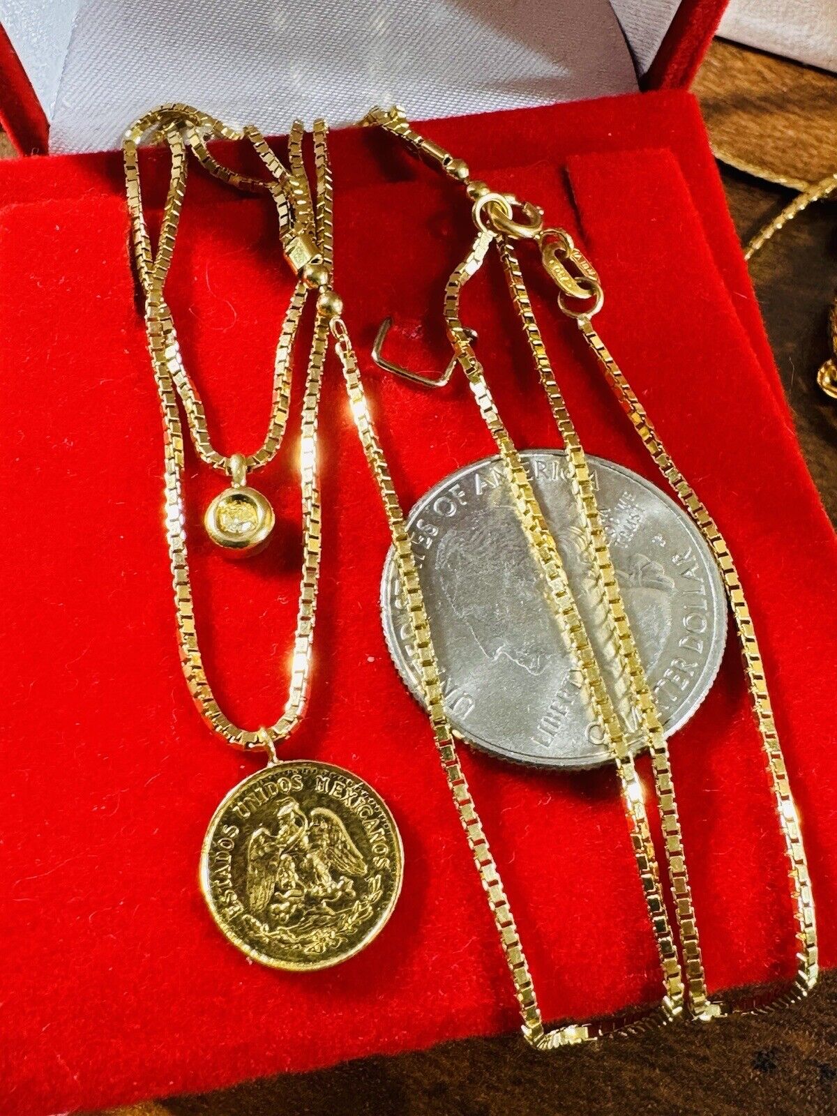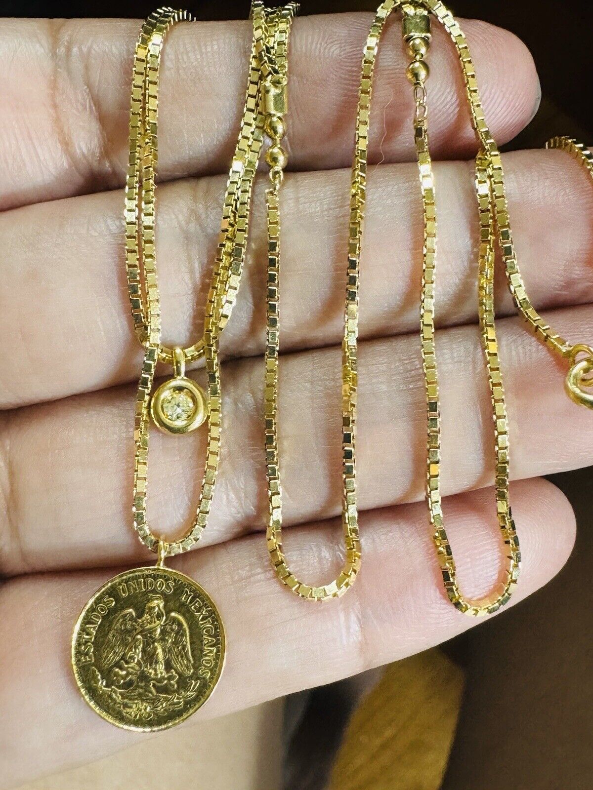 18K 750 Fine Yellow Gold Dos Pesos Coin Necklace 18” /19” Long 9.3g