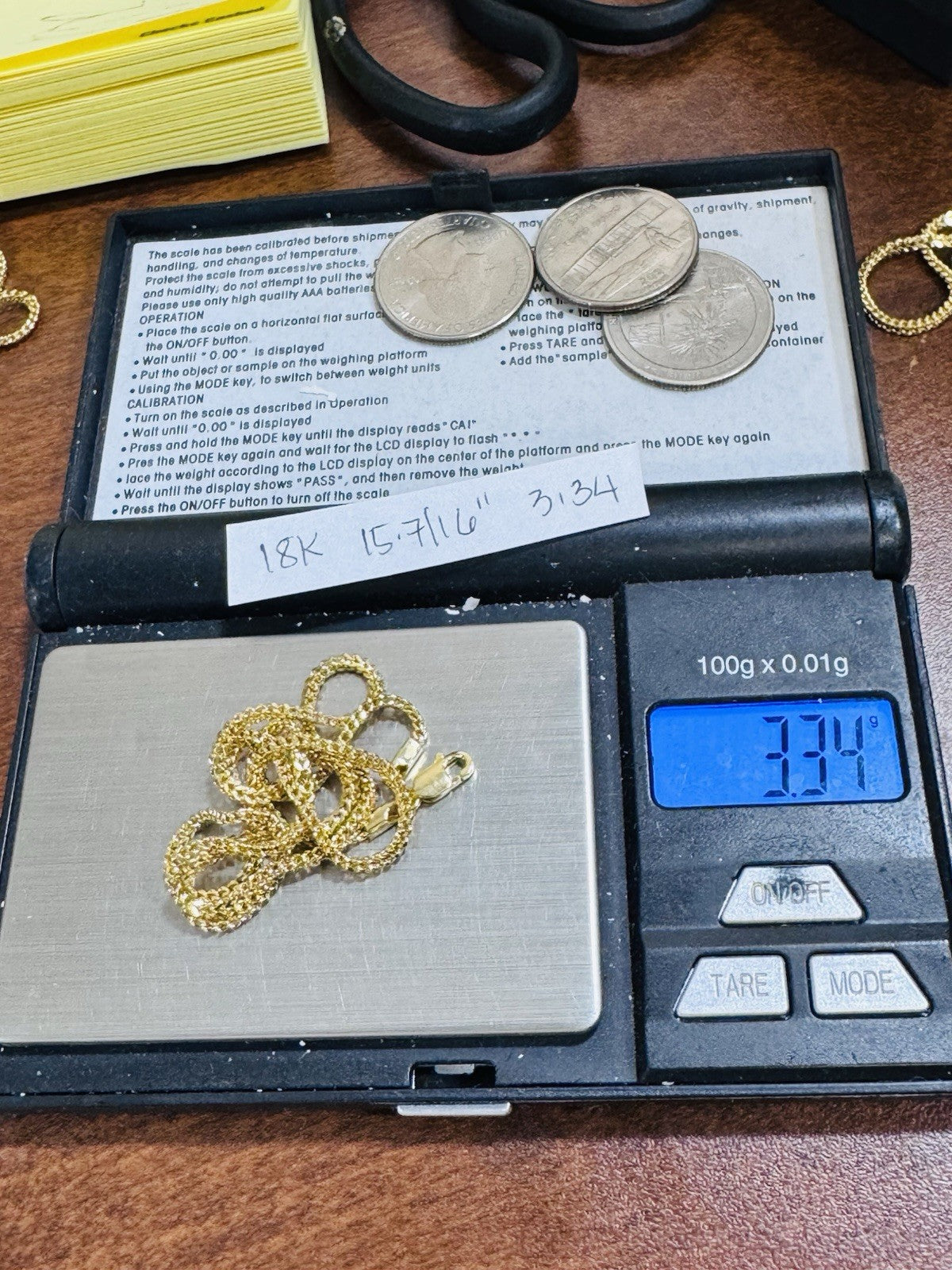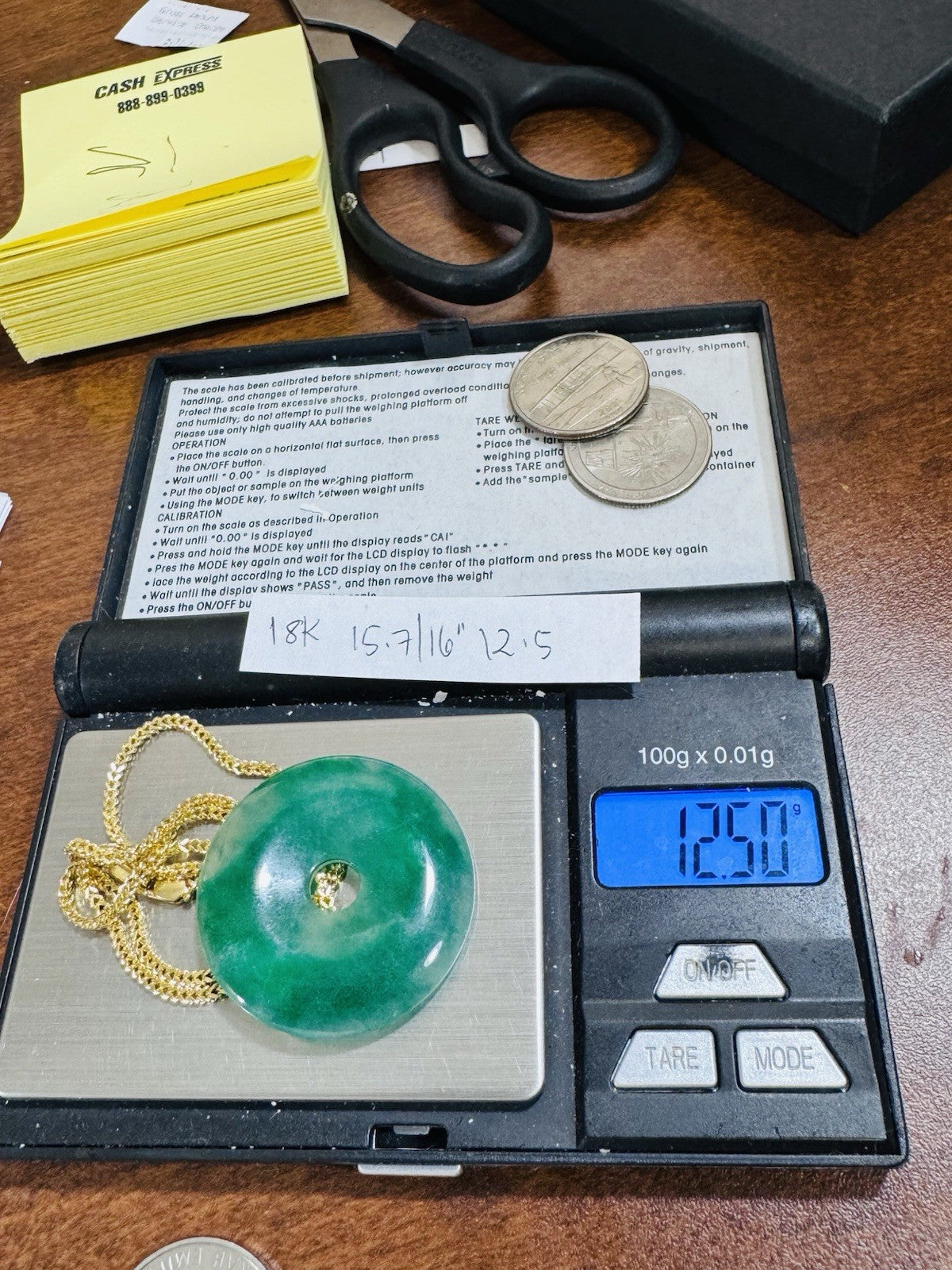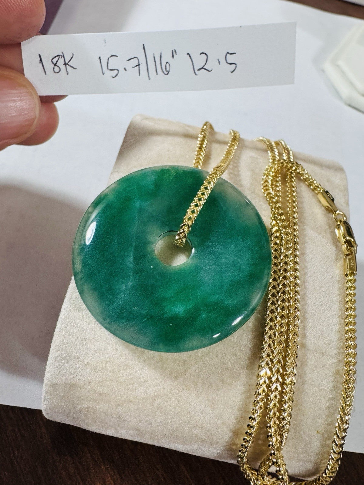 This Chain necklace features a 18K 750 pure gold with Donut jade set, measuring 15.8” / 16” in length chain and total weighing 12.5g