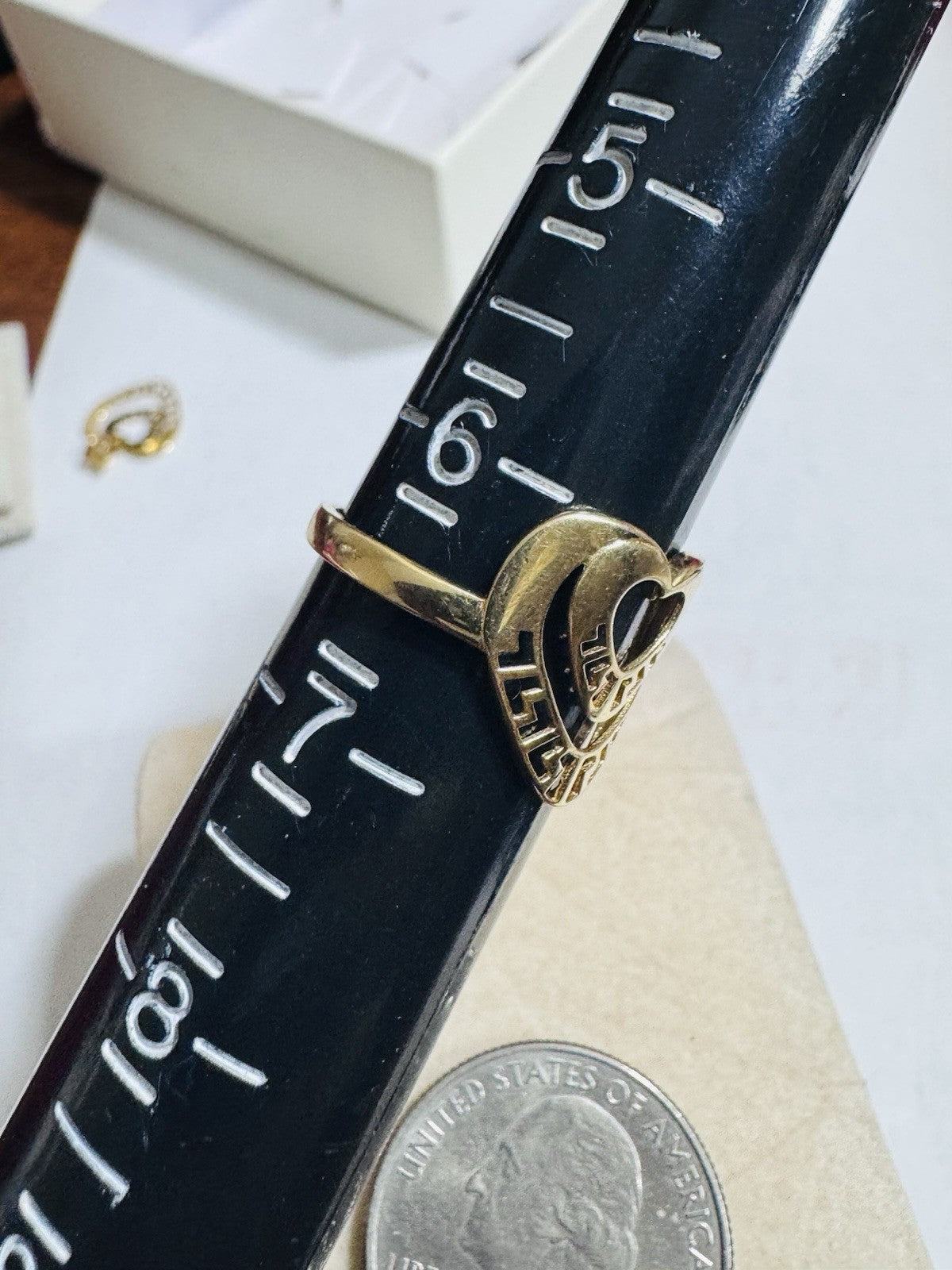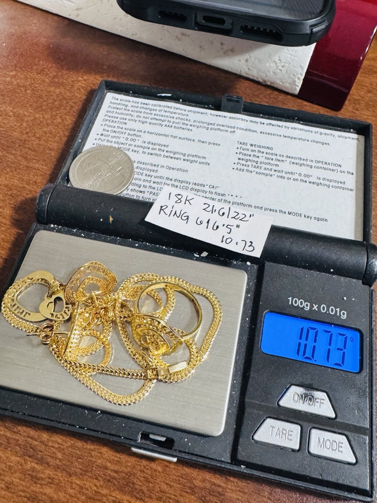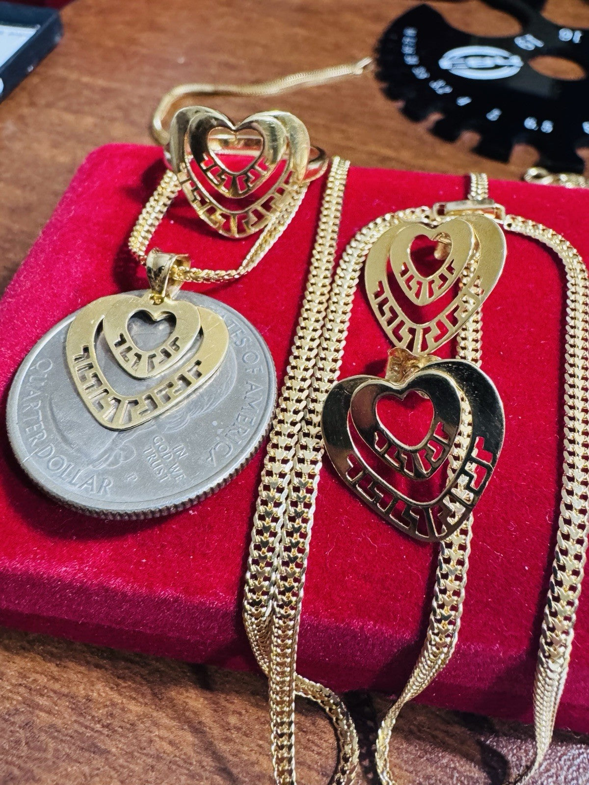 The necklace features a heart-shaped pendant with a snap closure and a chain style design. Made from high-quality gold with a weight of 10.7g total grams Ring fits 6/6.5” and 21.6” long chain.