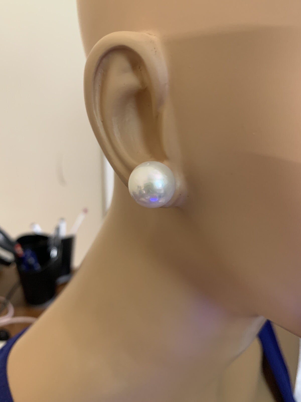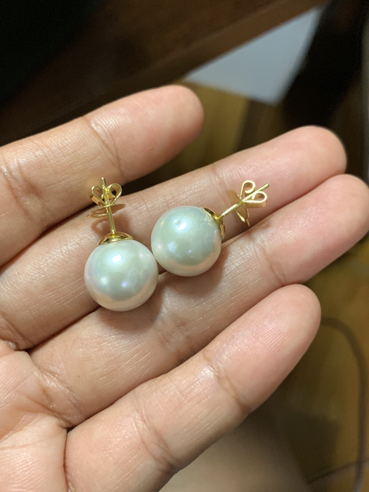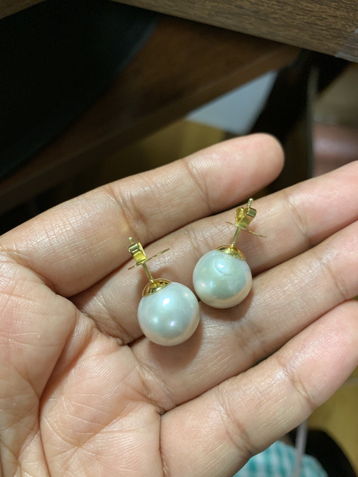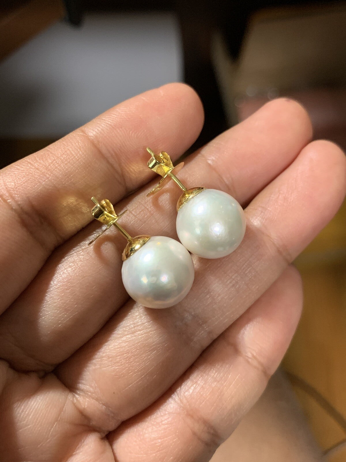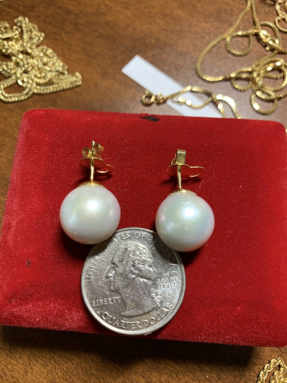 18K Fine Saudi Real Gold Women’s South Sea Ivory White Pearl Earring 13mm 7.93g