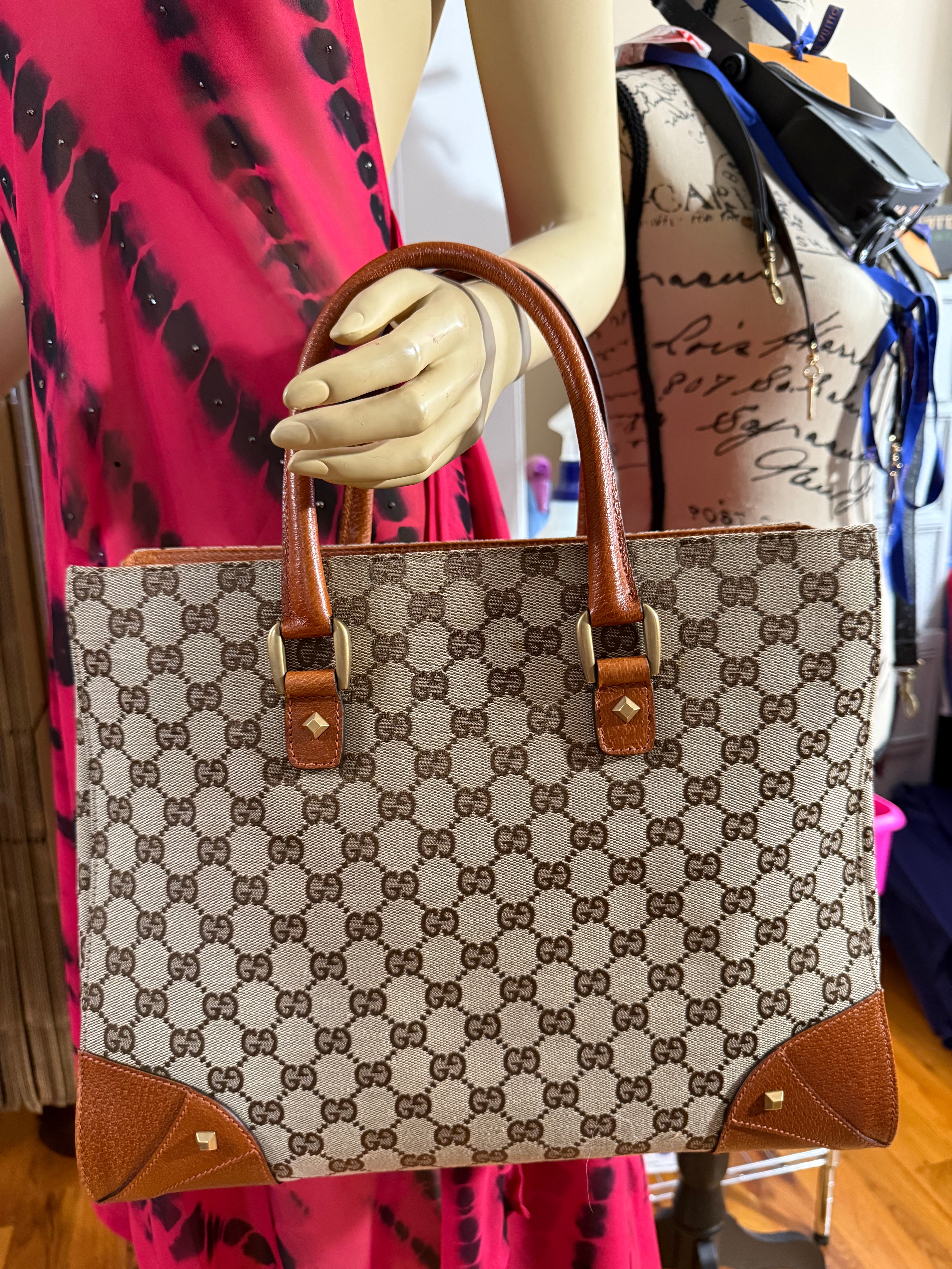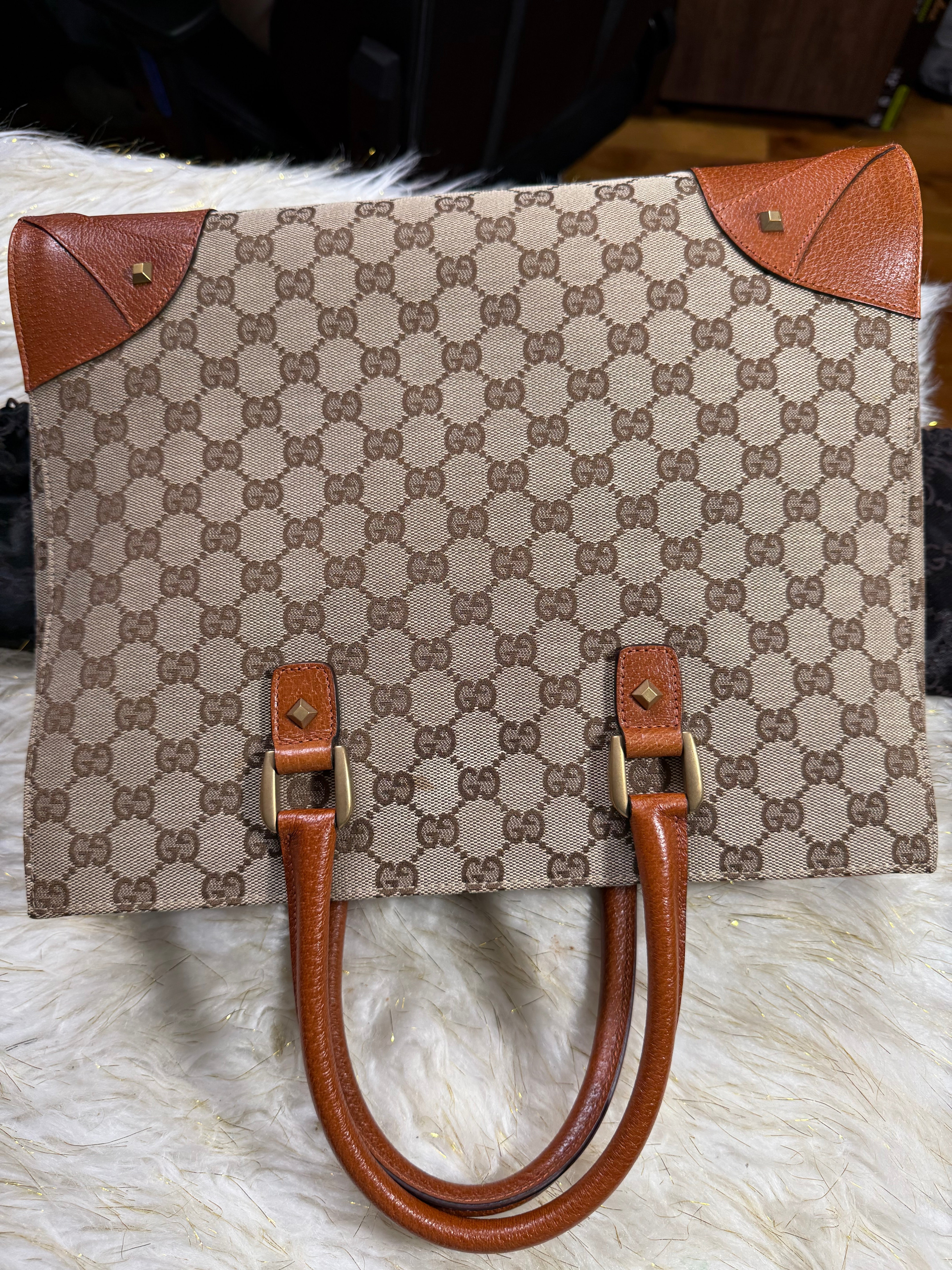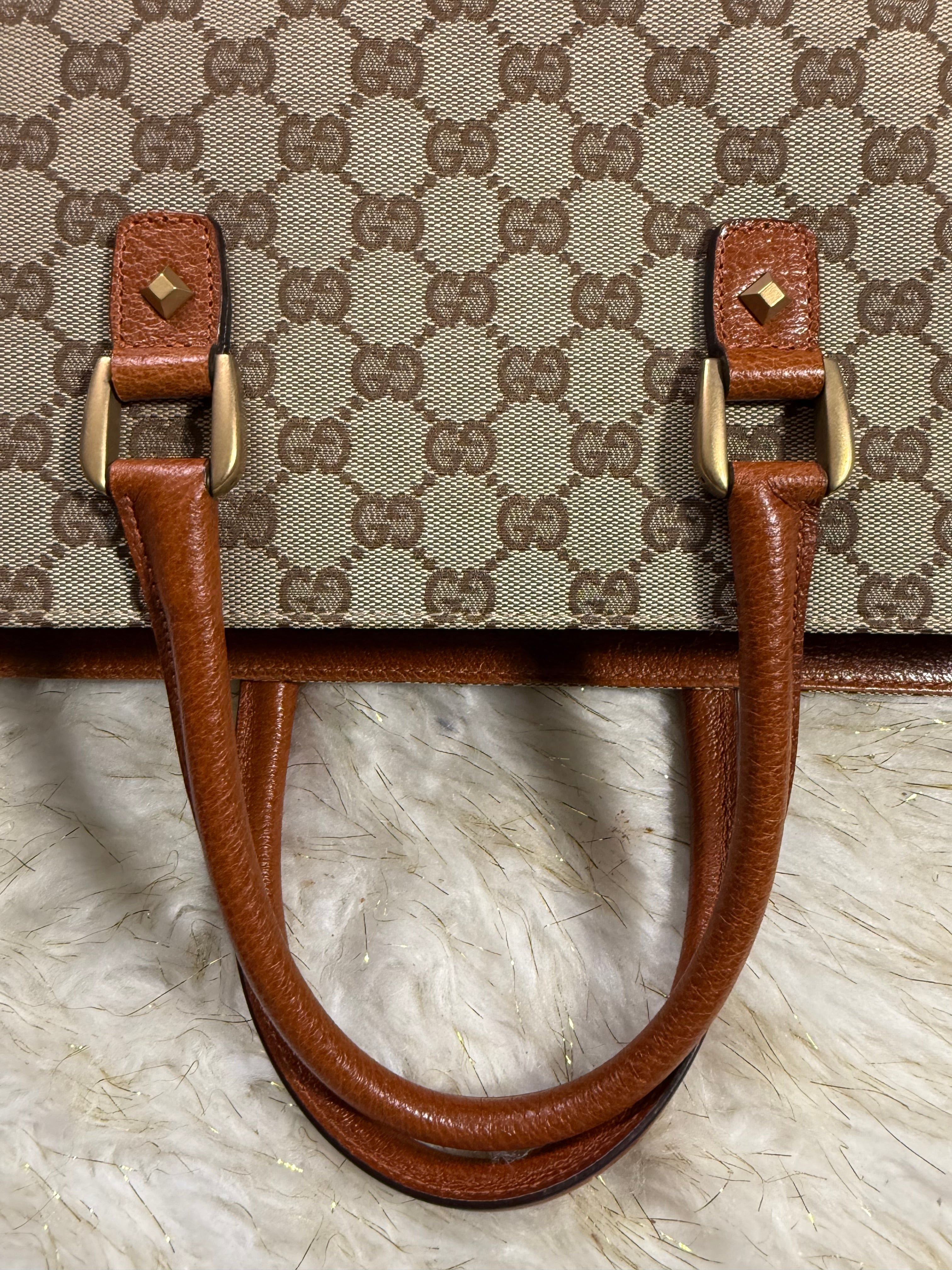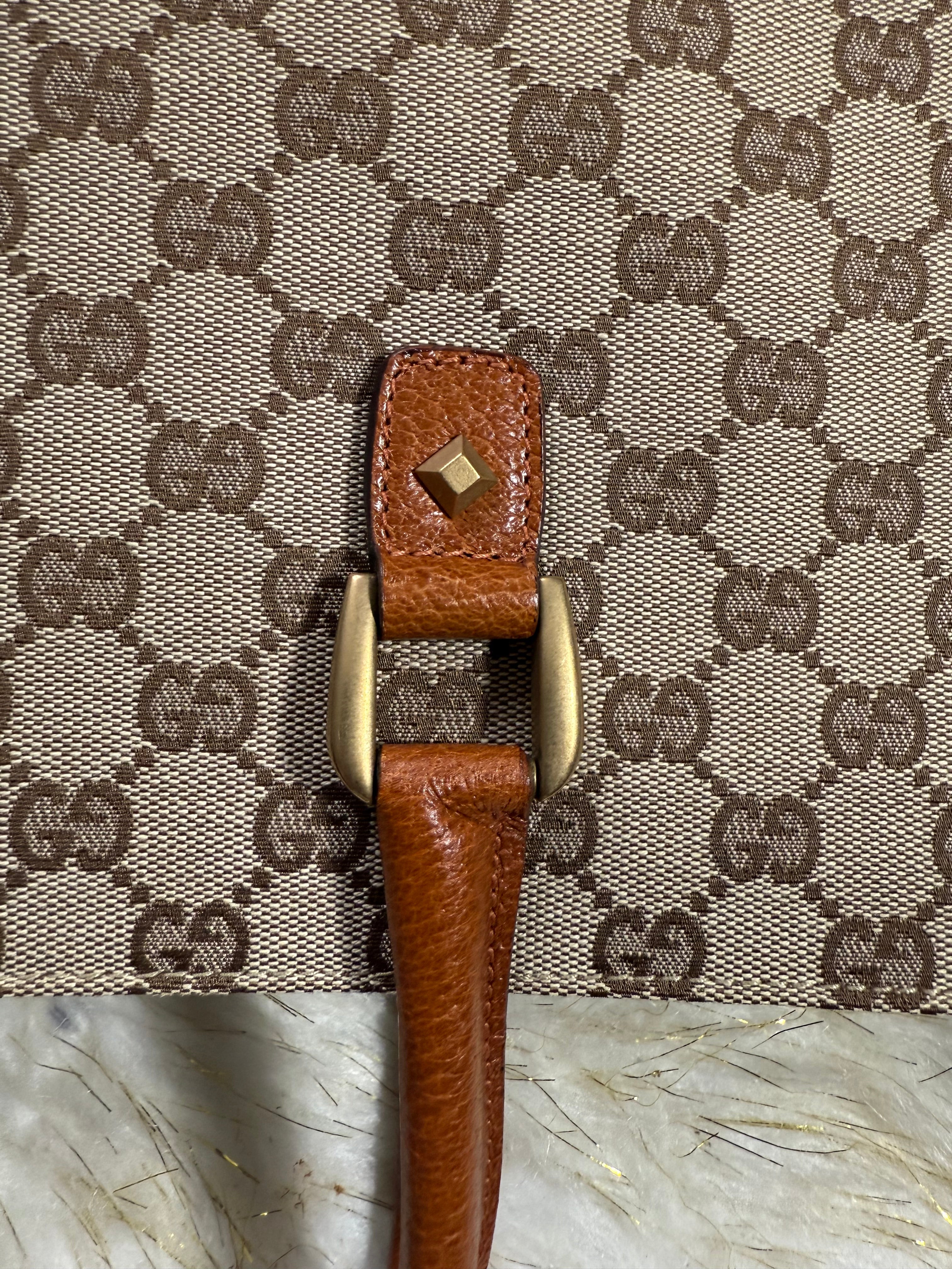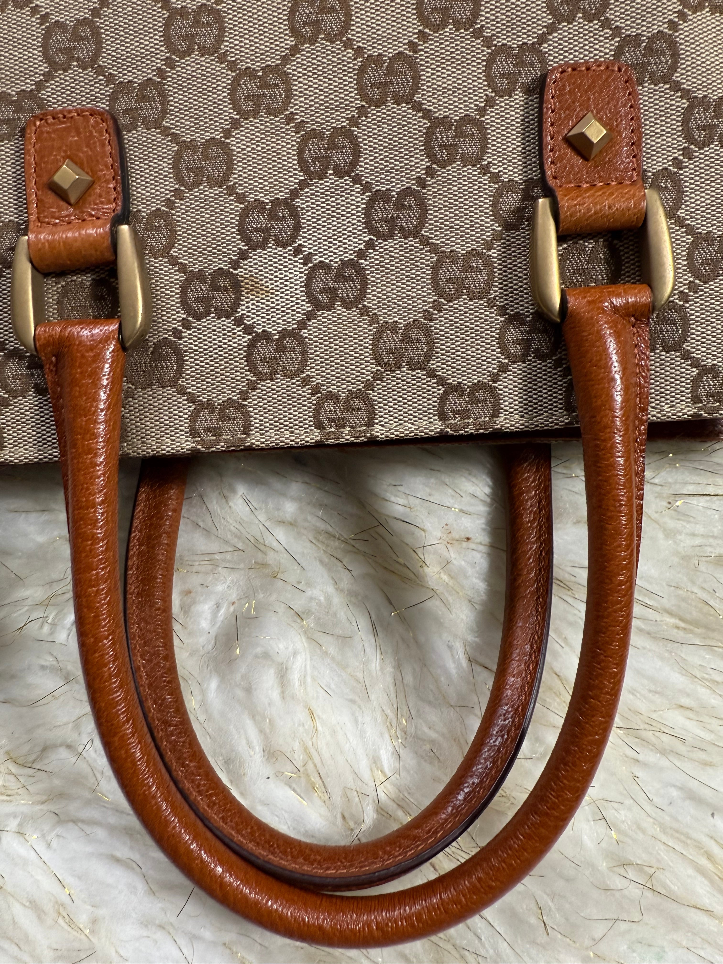 Stylish Gucci handbag with iconic monogram pattern. Features brown leather accents and tan canvas.