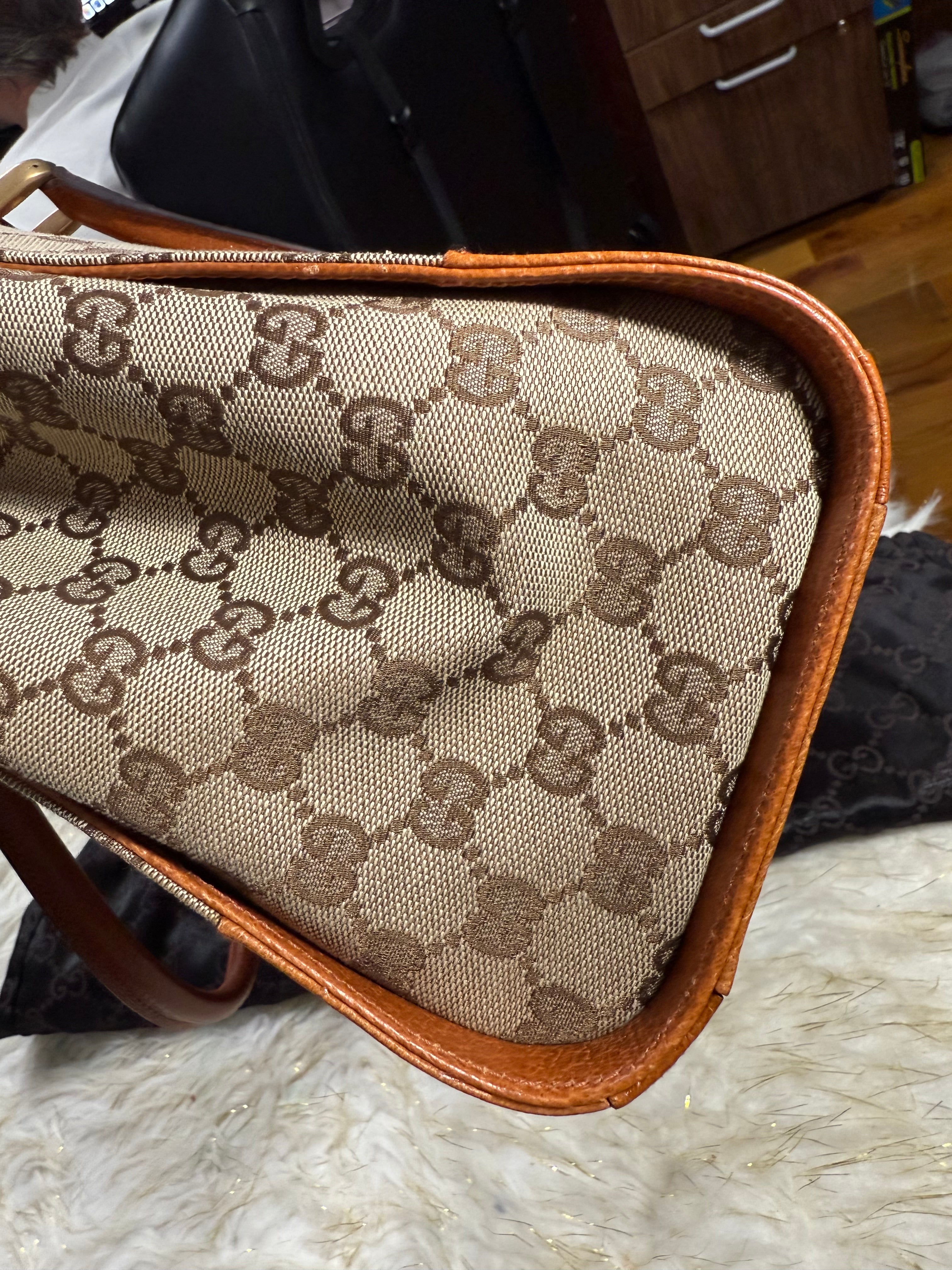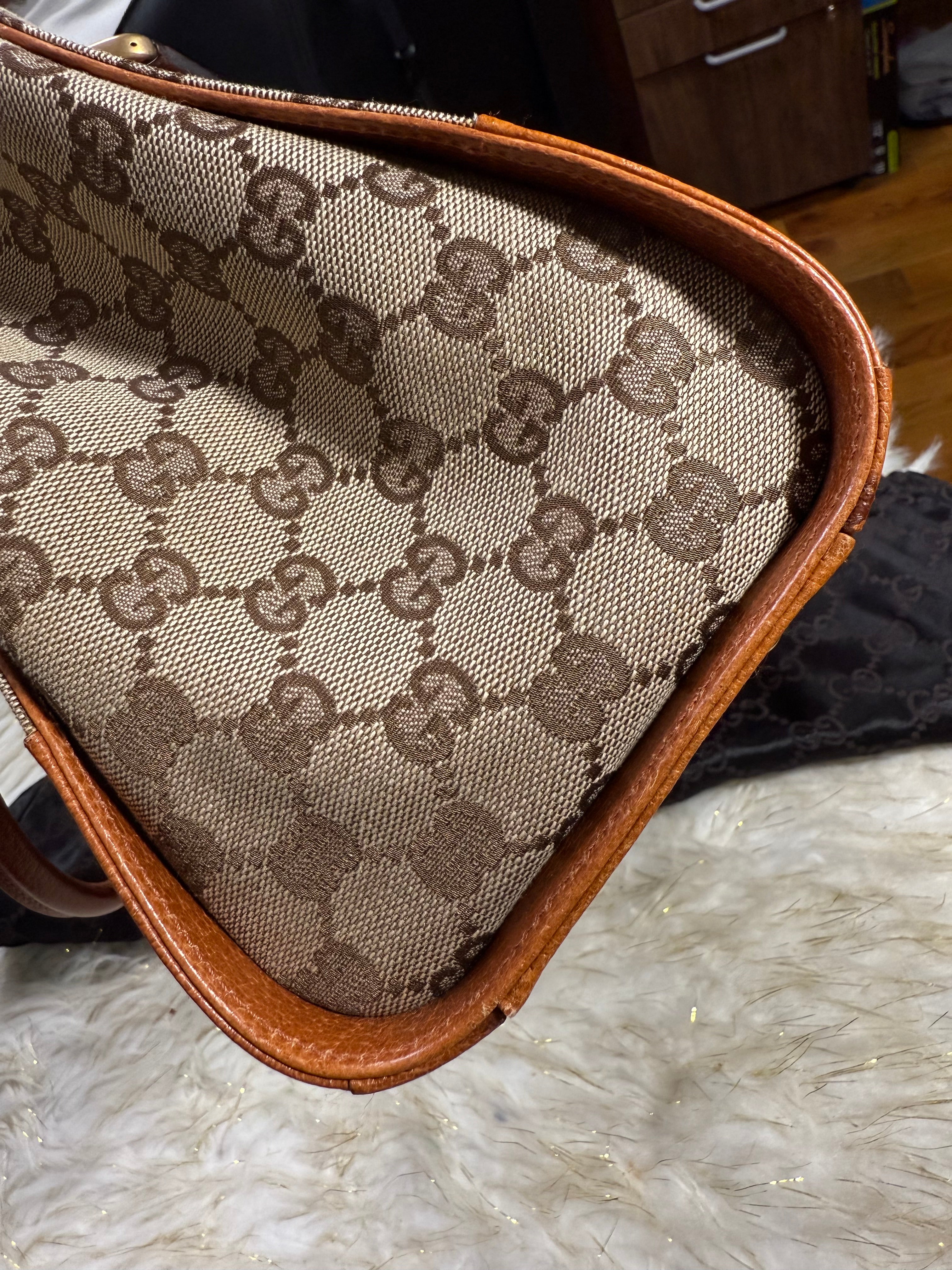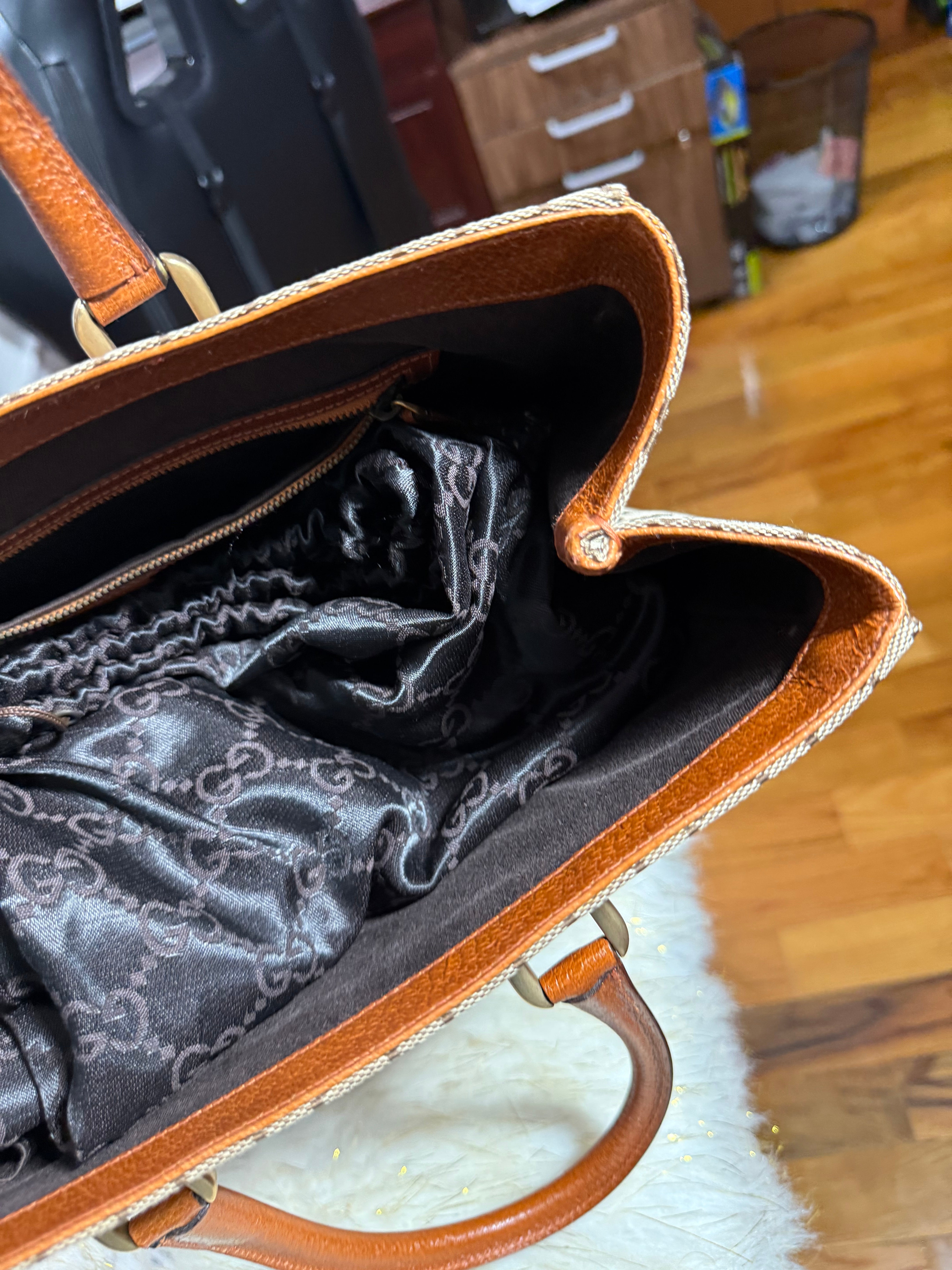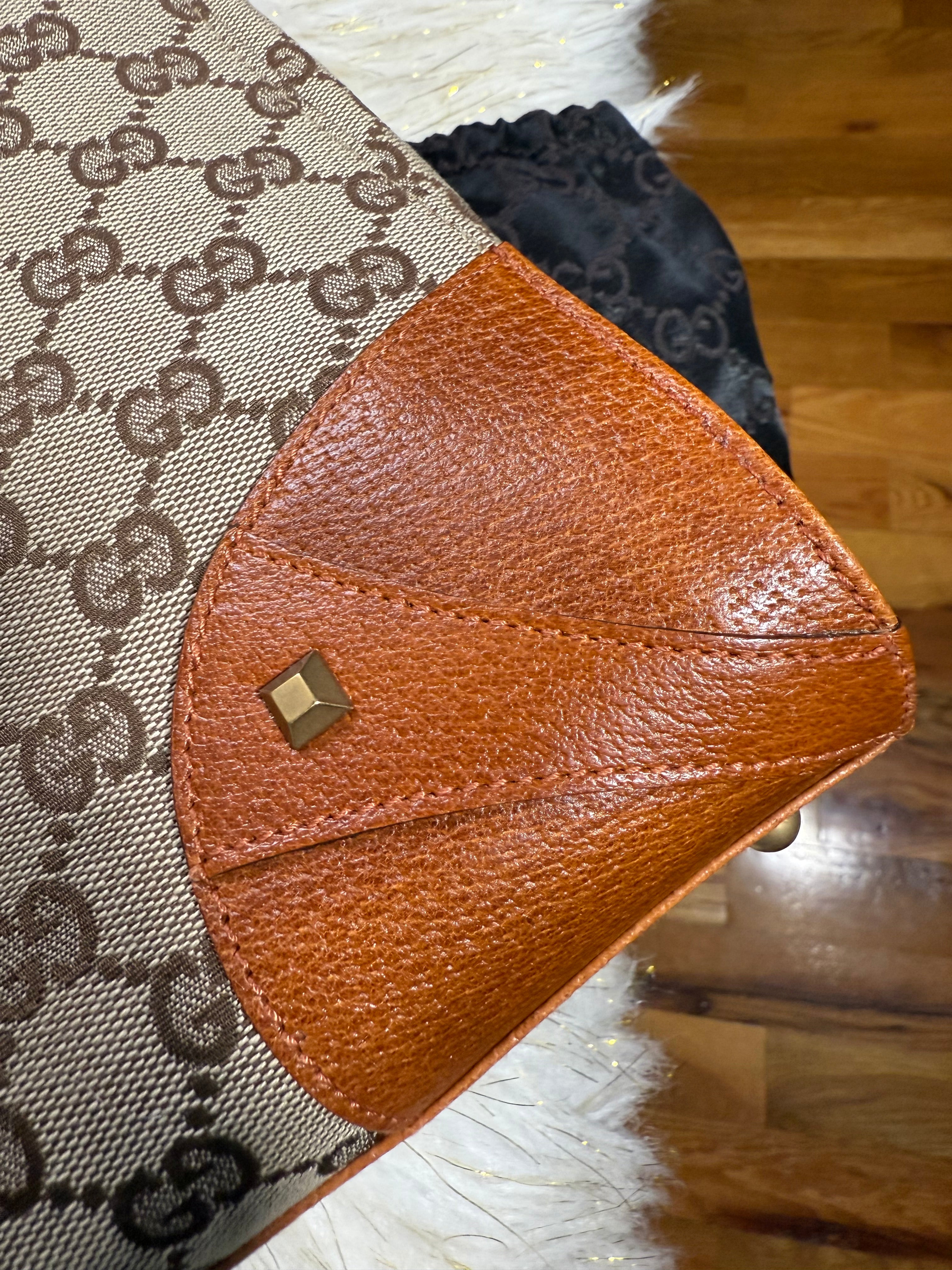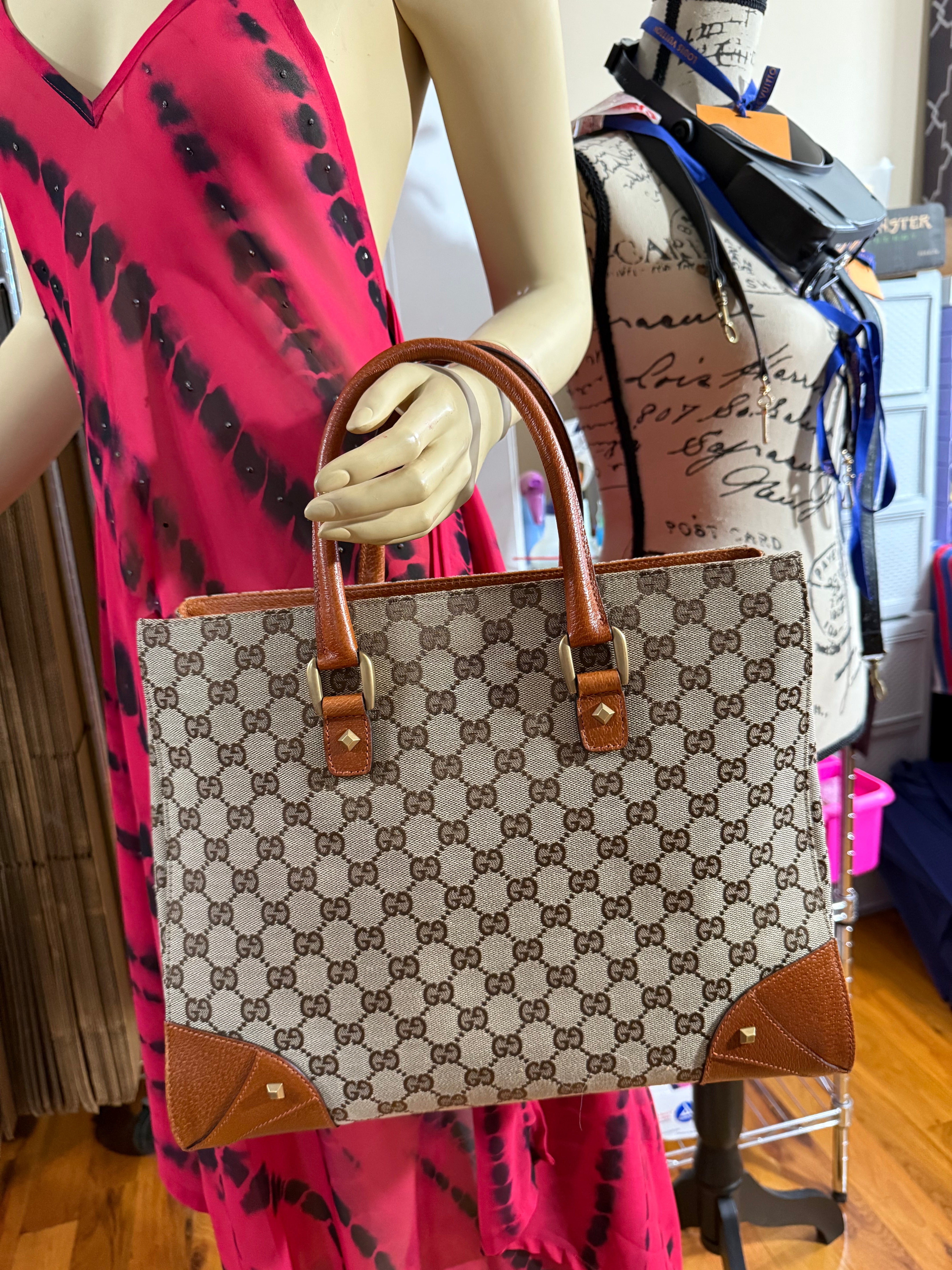 Stylish Gucci handbag with iconic monogram pattern. Features brown leather accents and tan canvas.