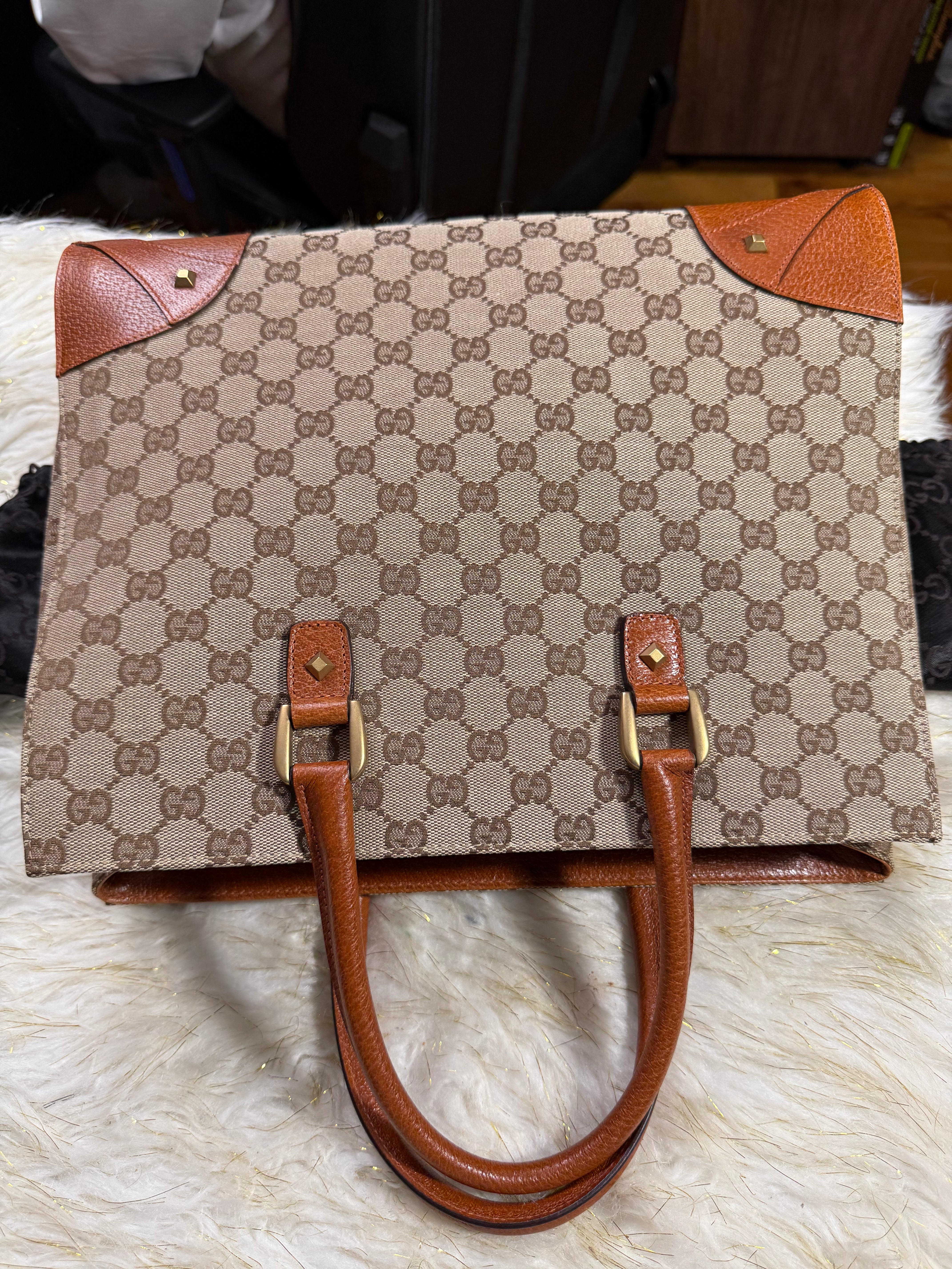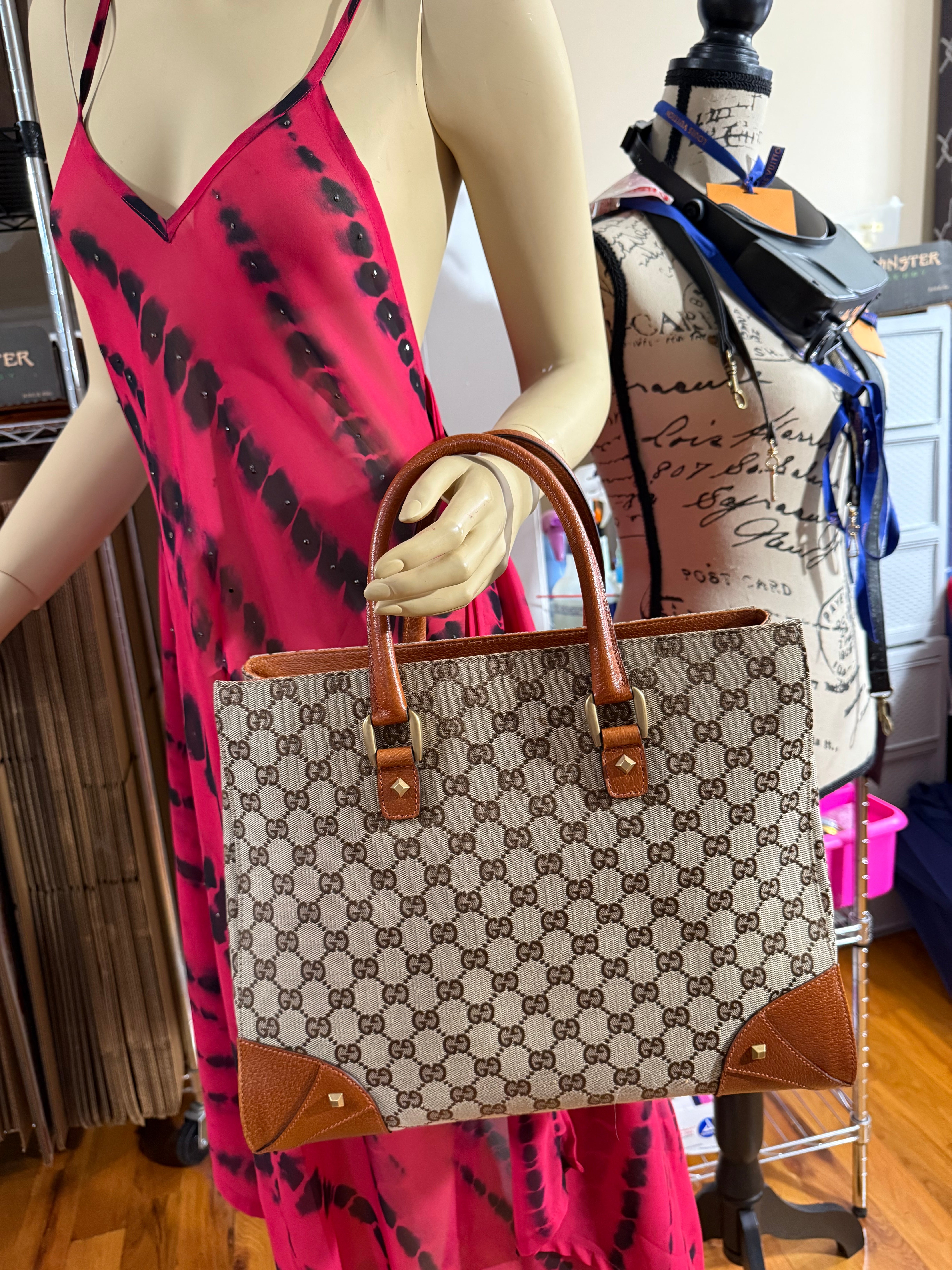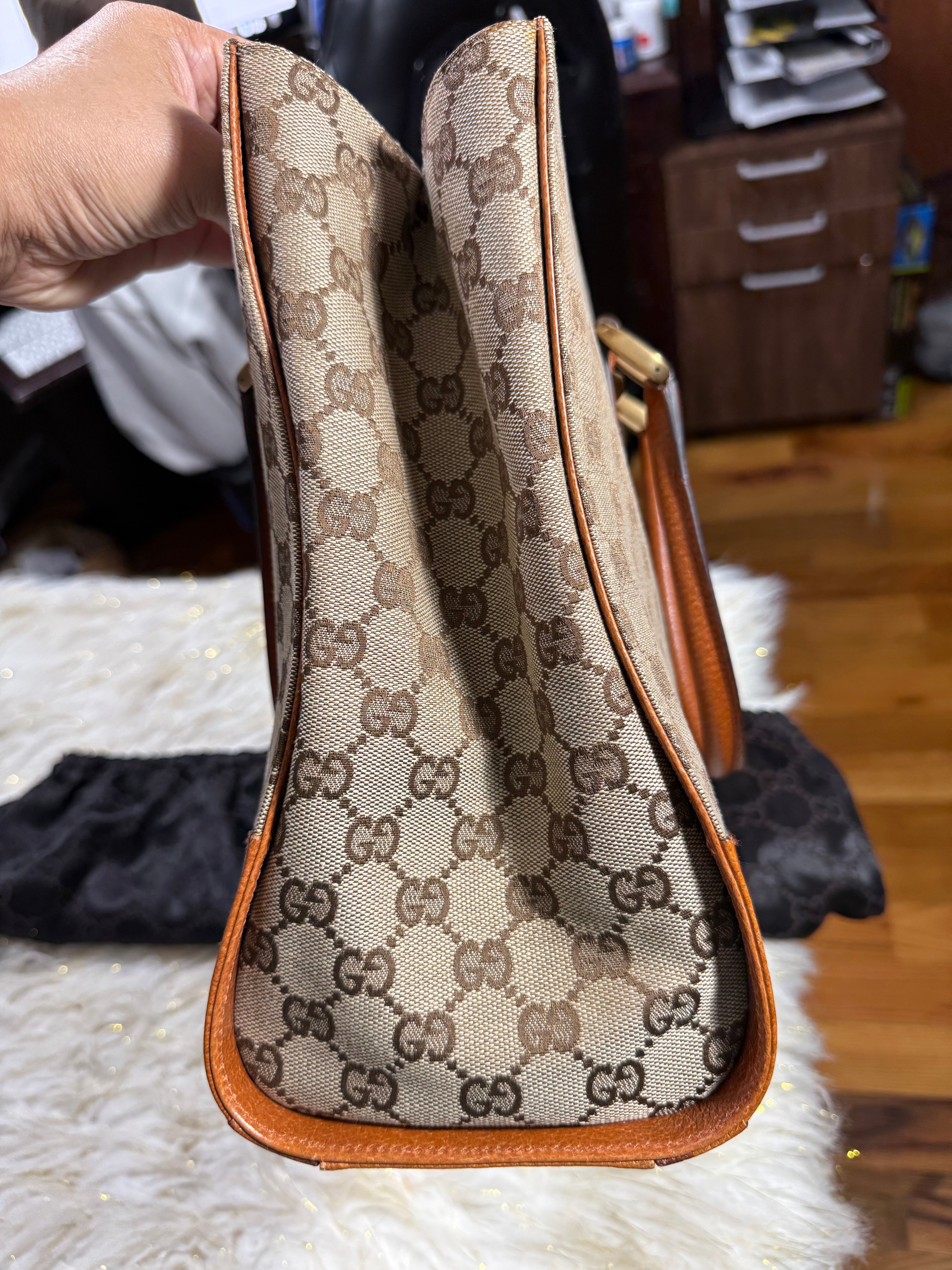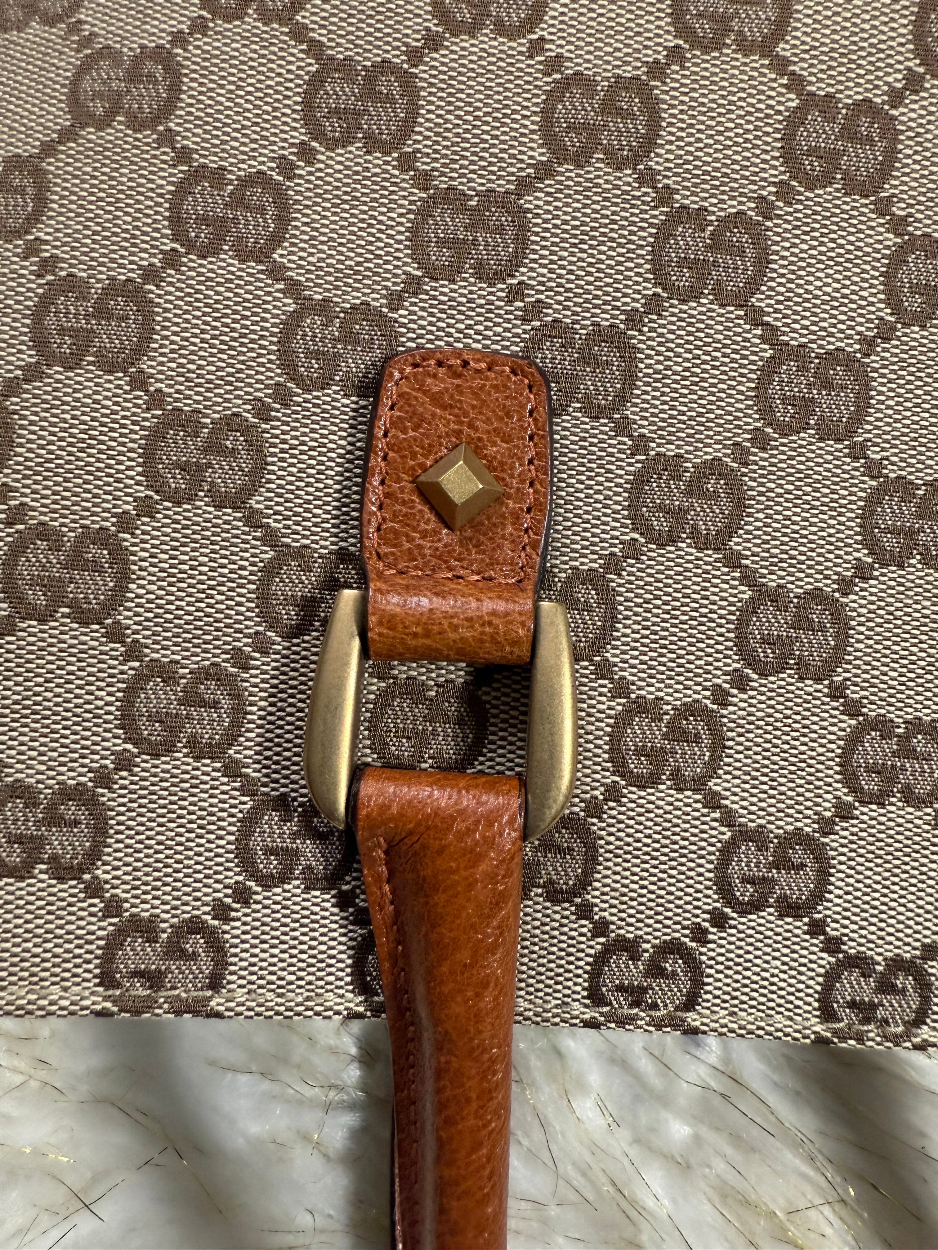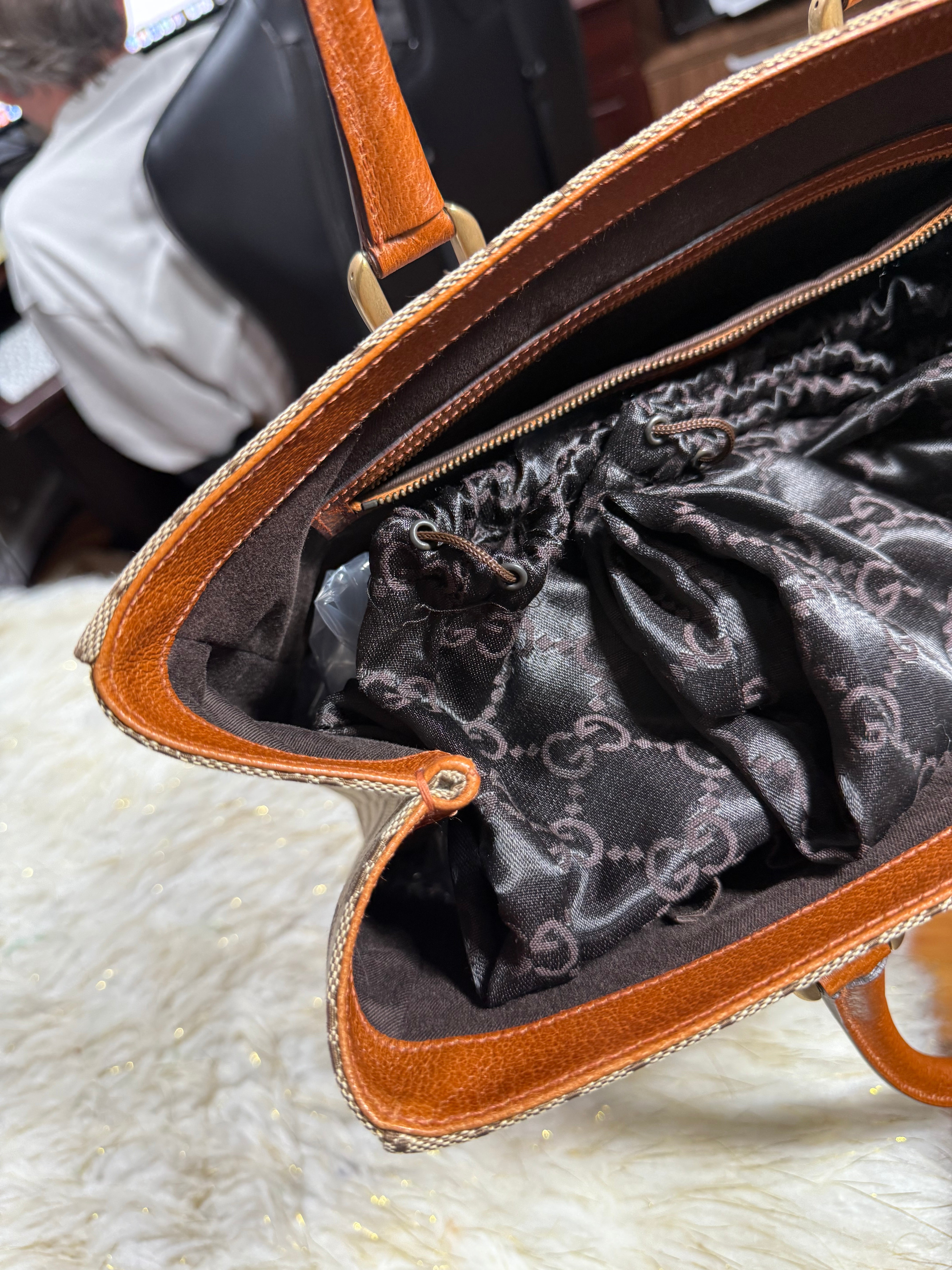 Stylish Gucci handbag with iconic monogram pattern. Features brown leather accents and tan canvas.