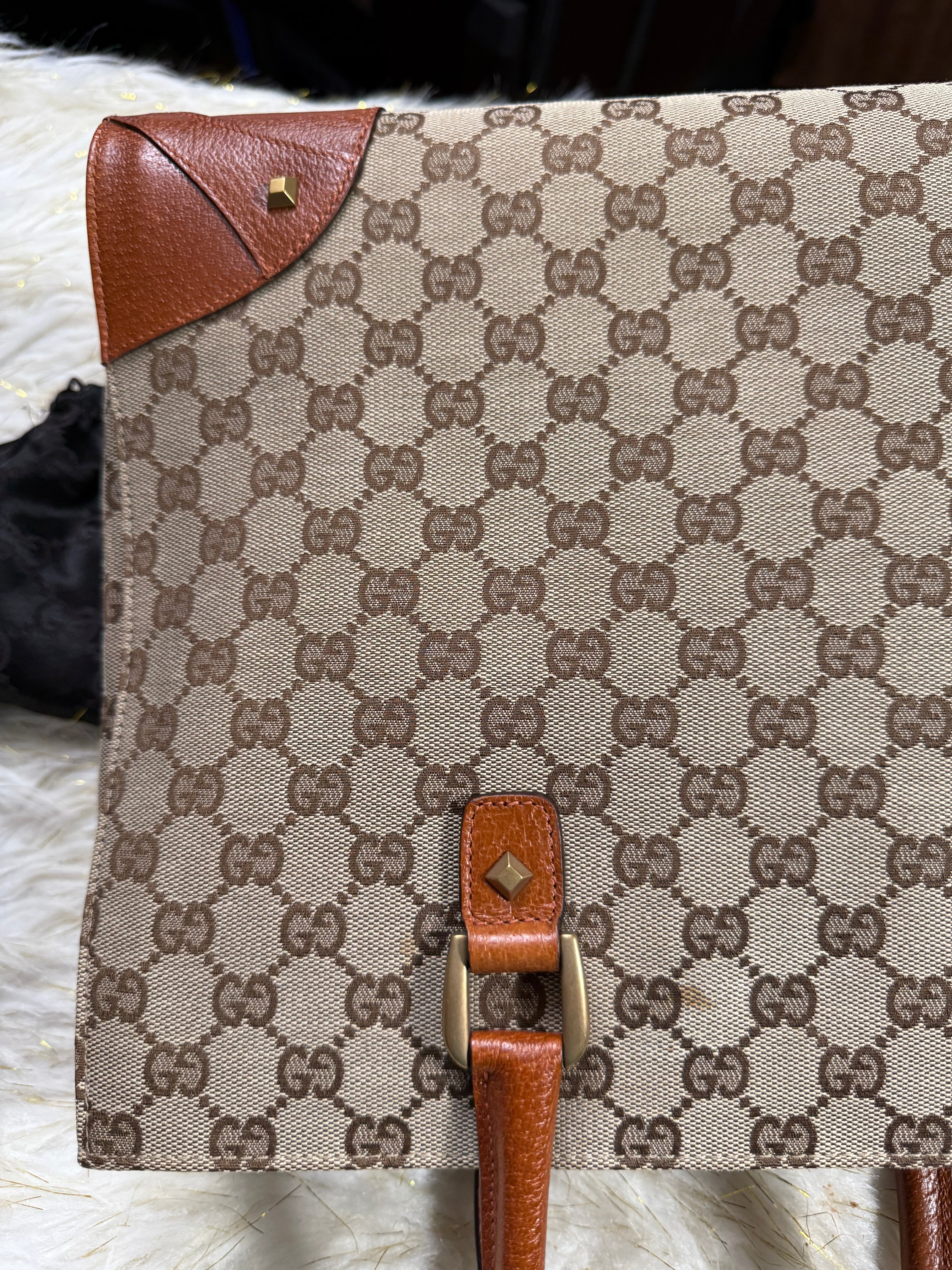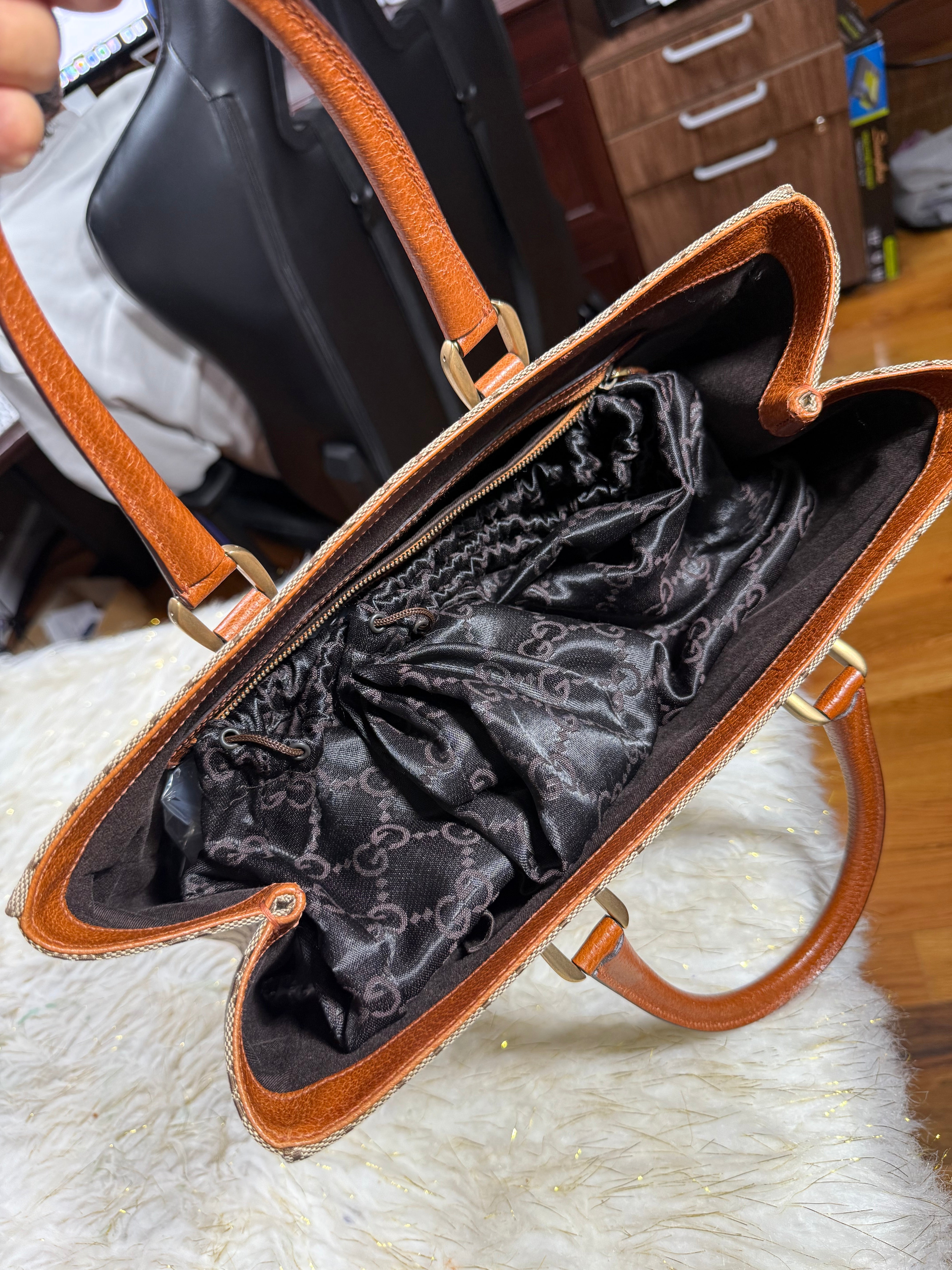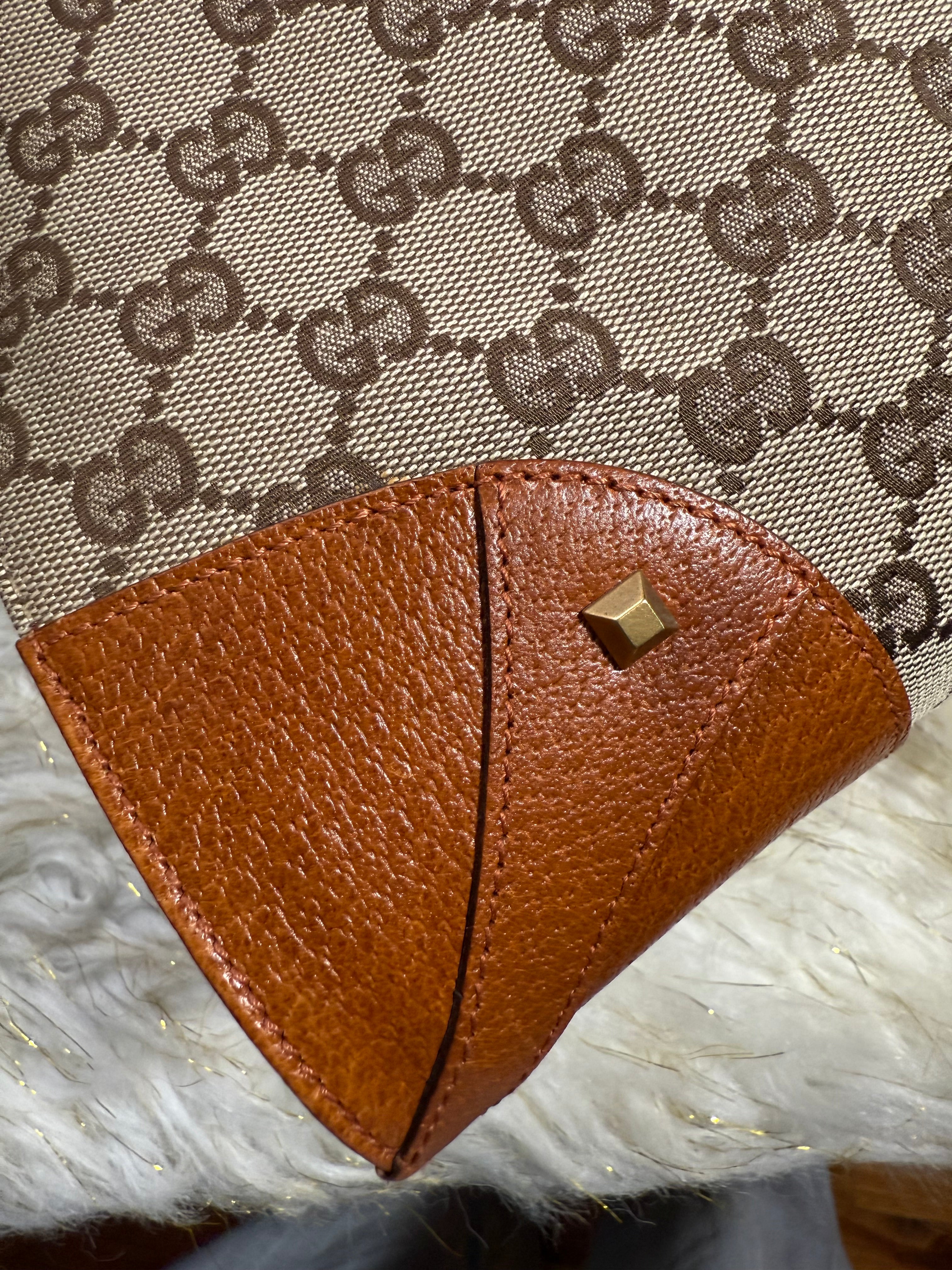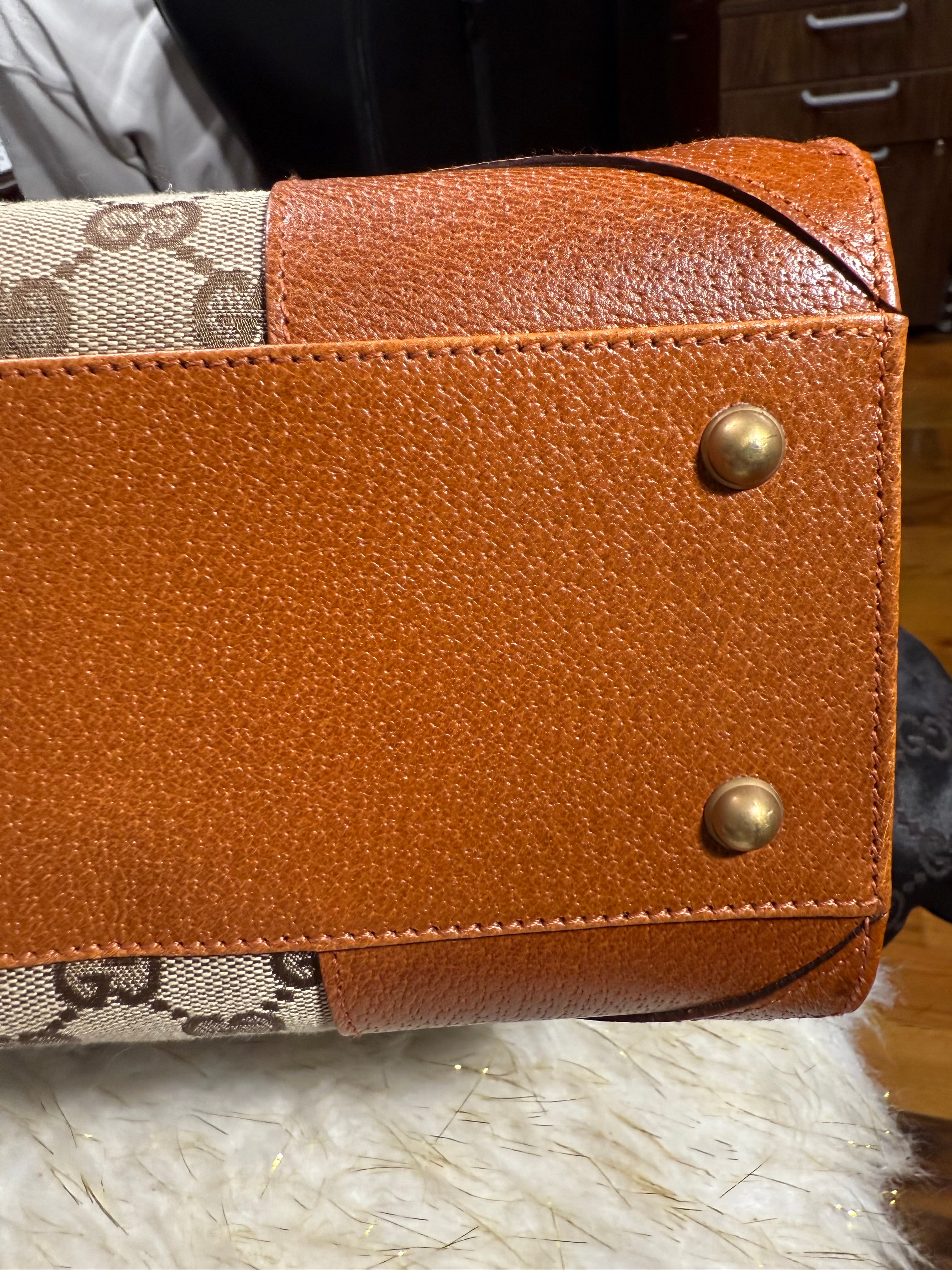 Stylish Gucci handbag with iconic monogram pattern. Features brown leather accents and tan canvas.