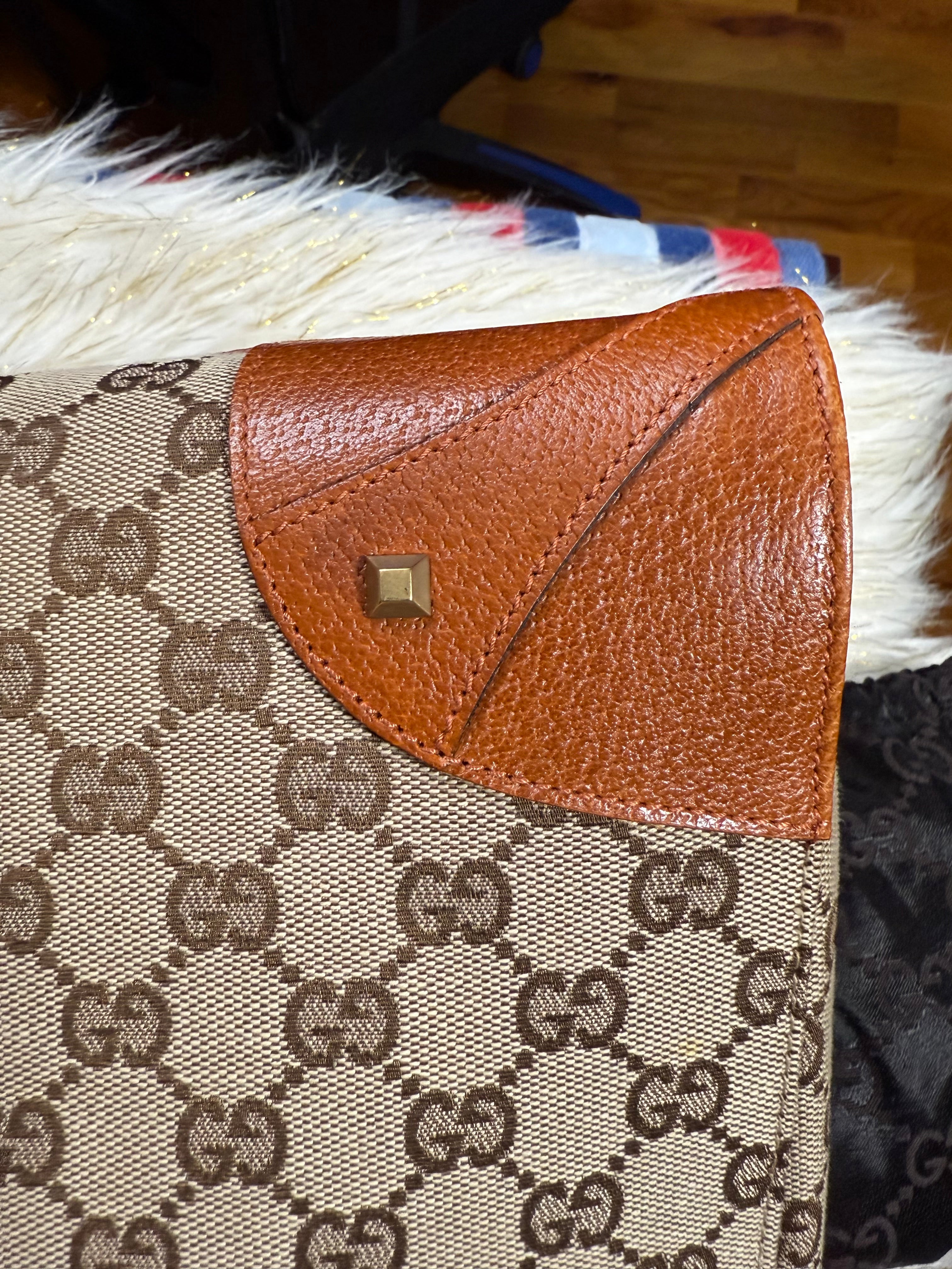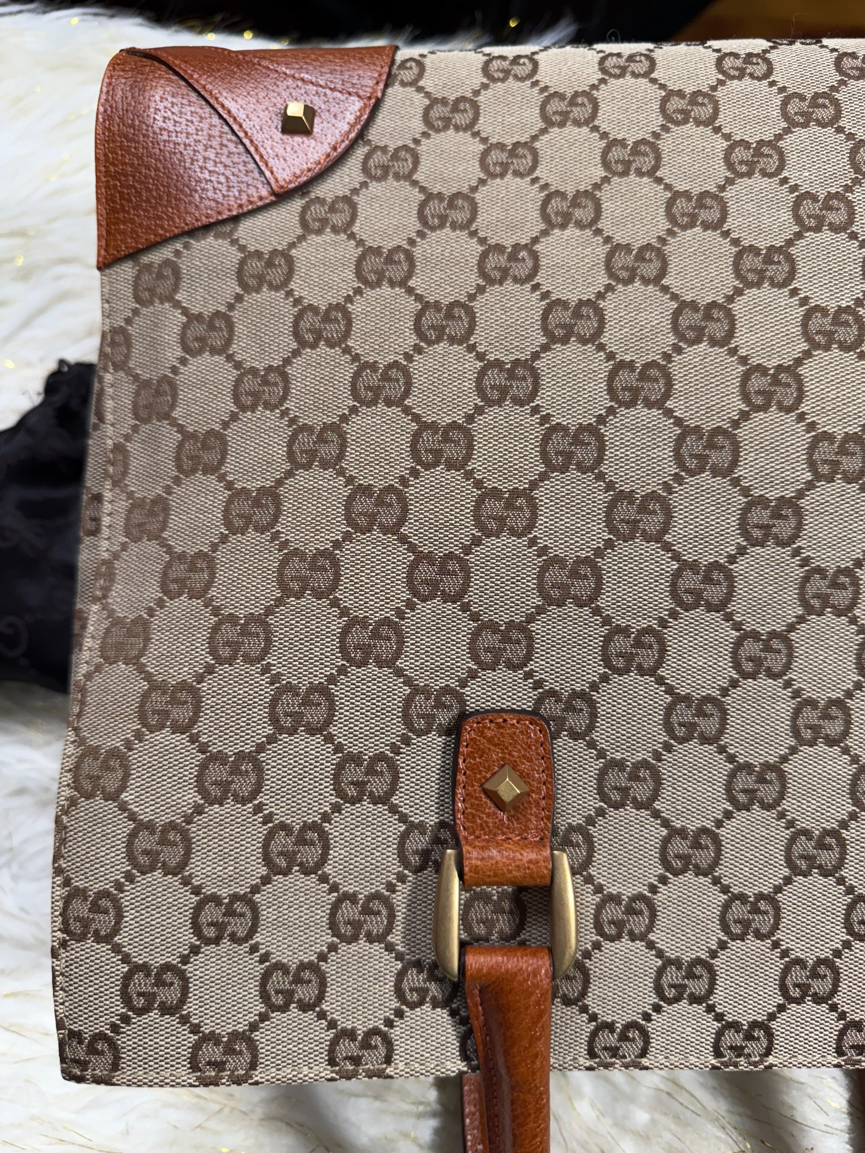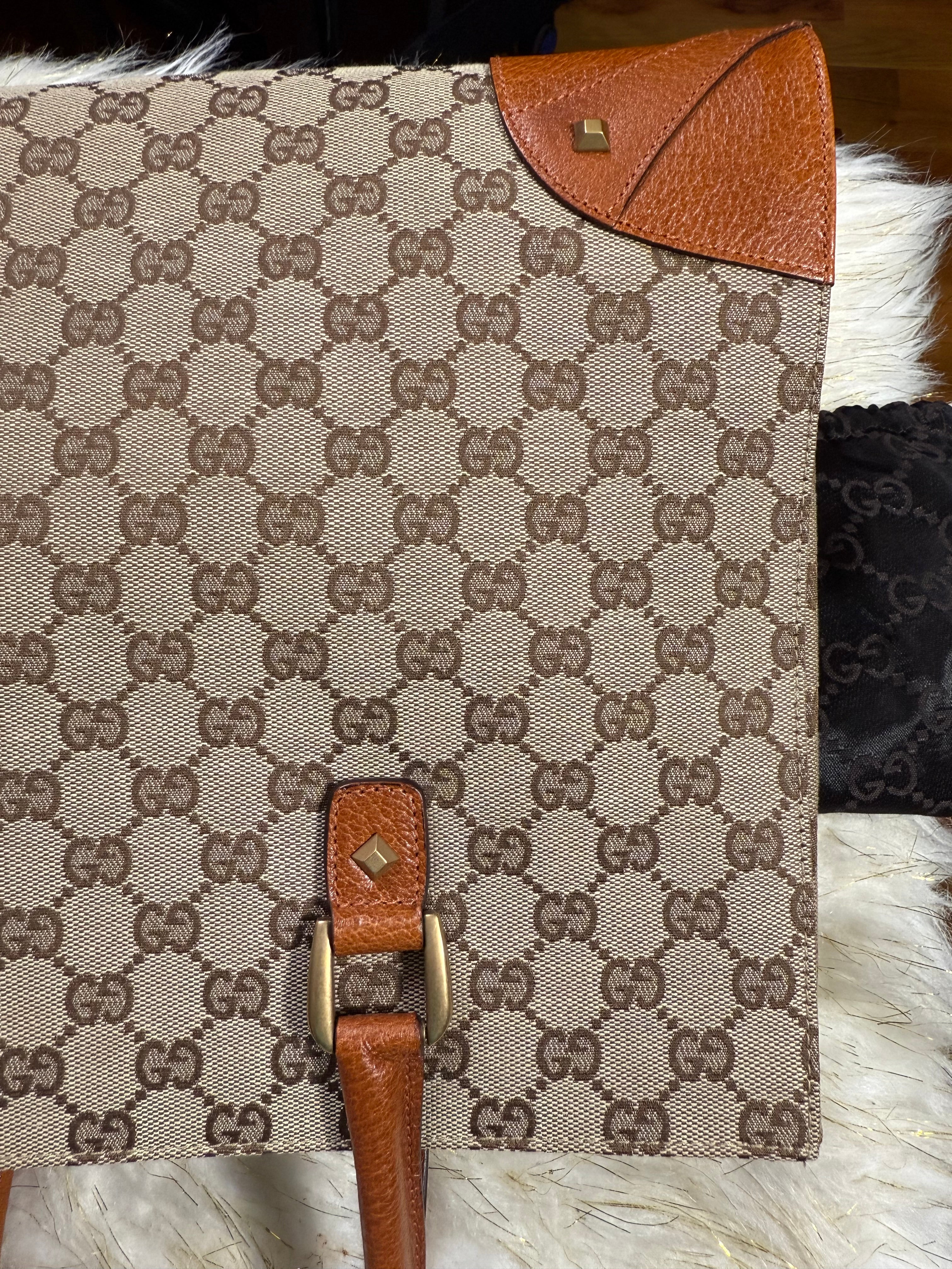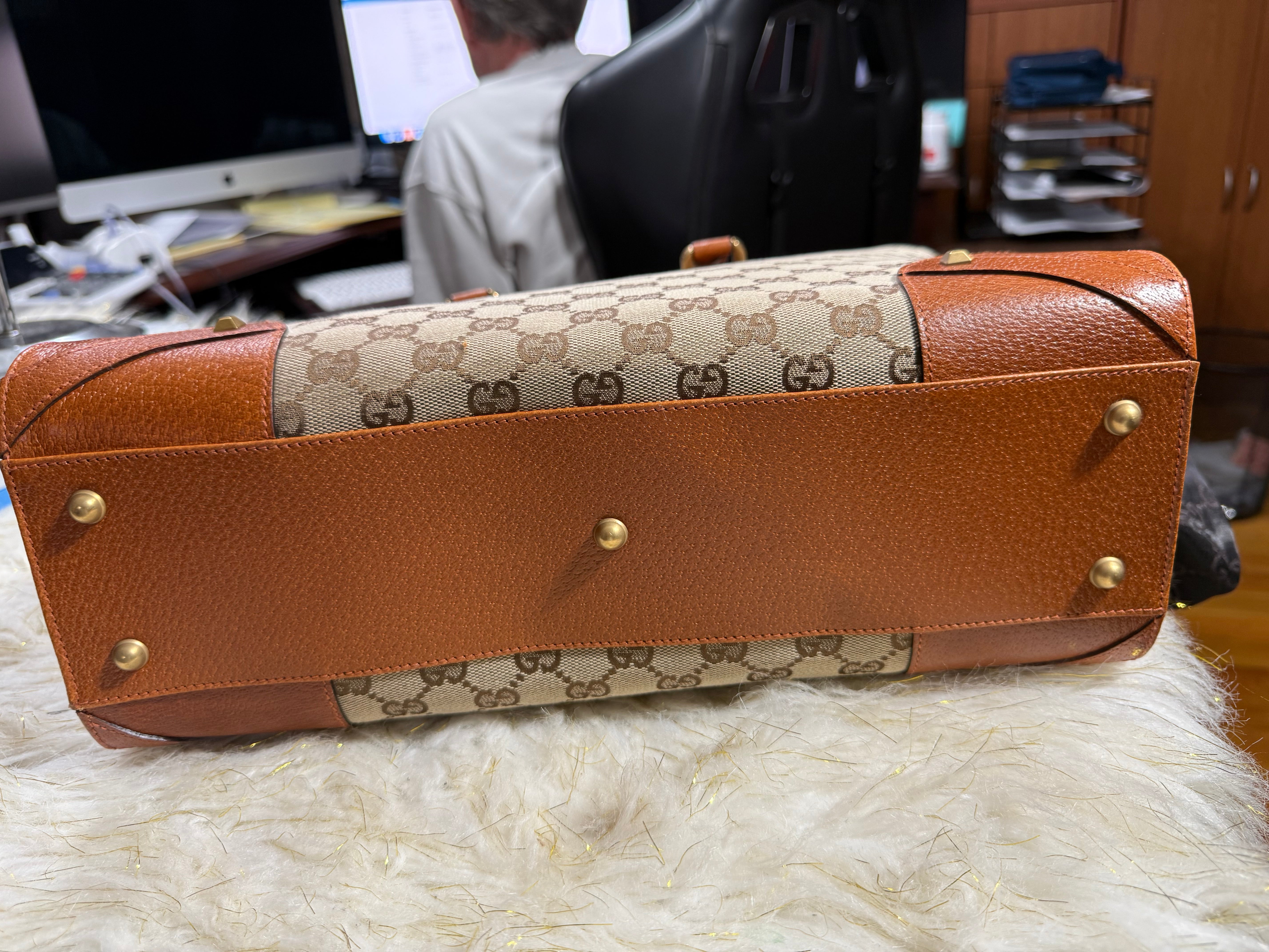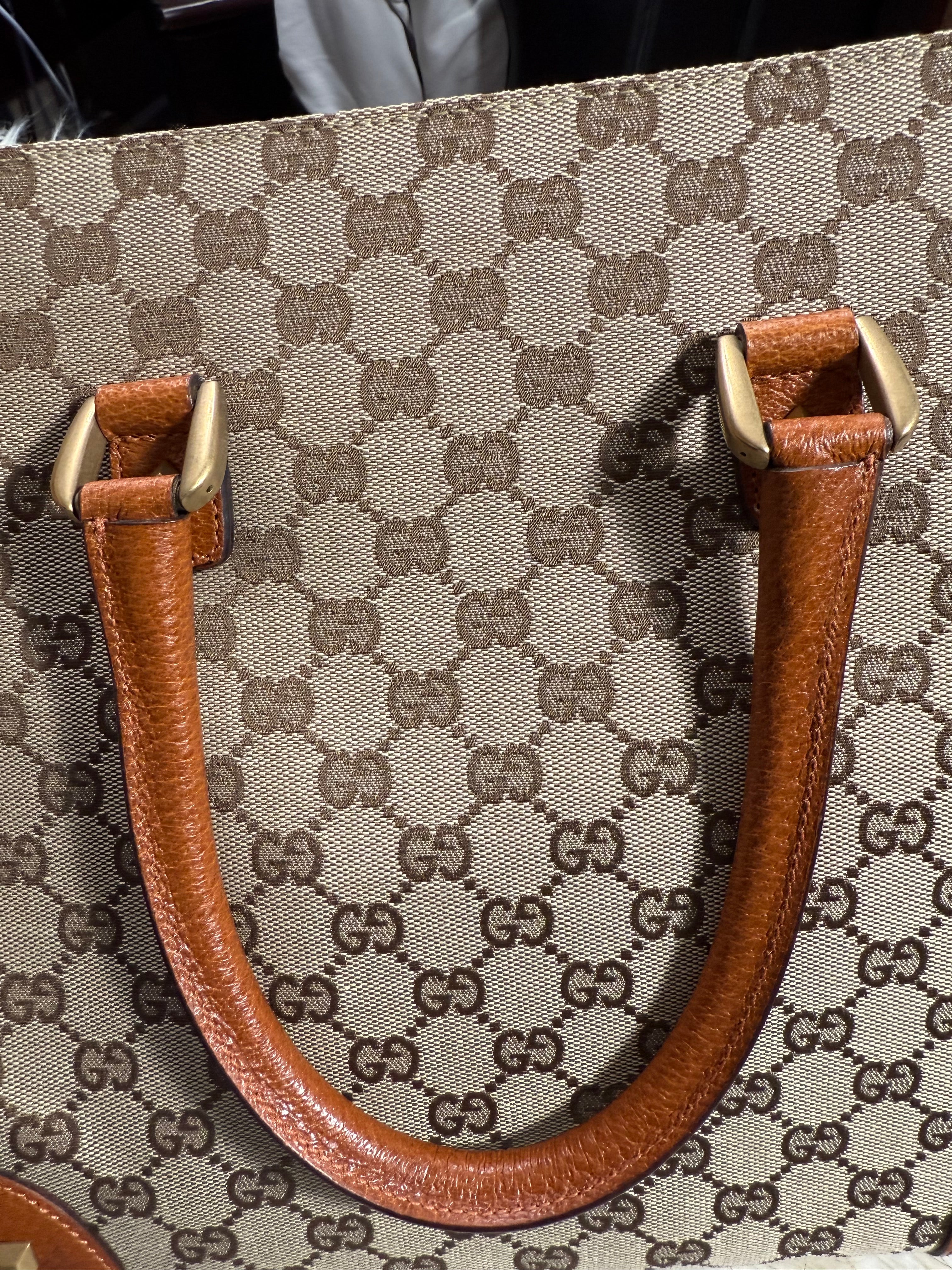 Stylish Gucci handbag with iconic monogram pattern. Features brown leather accents and tan canvas.