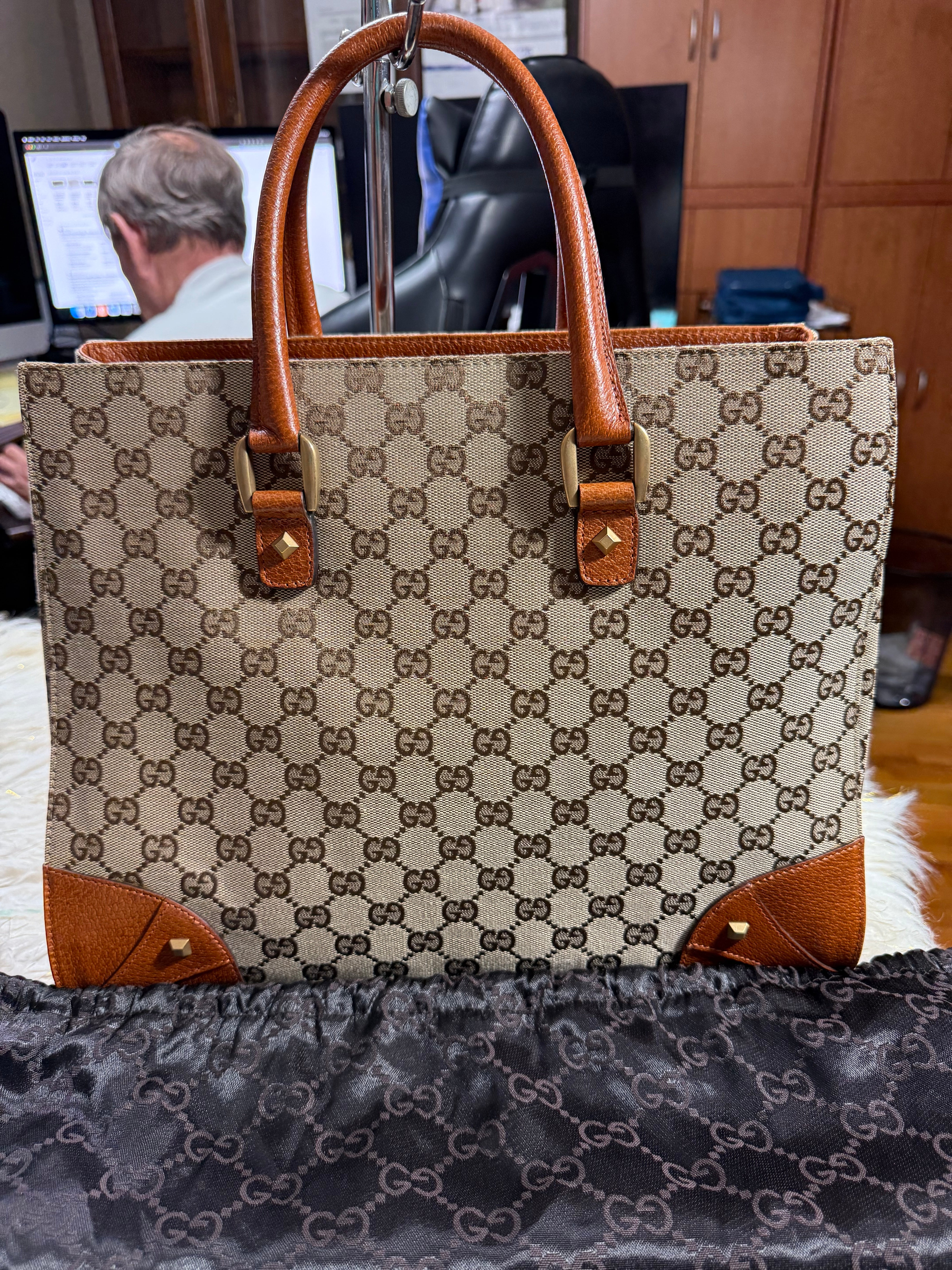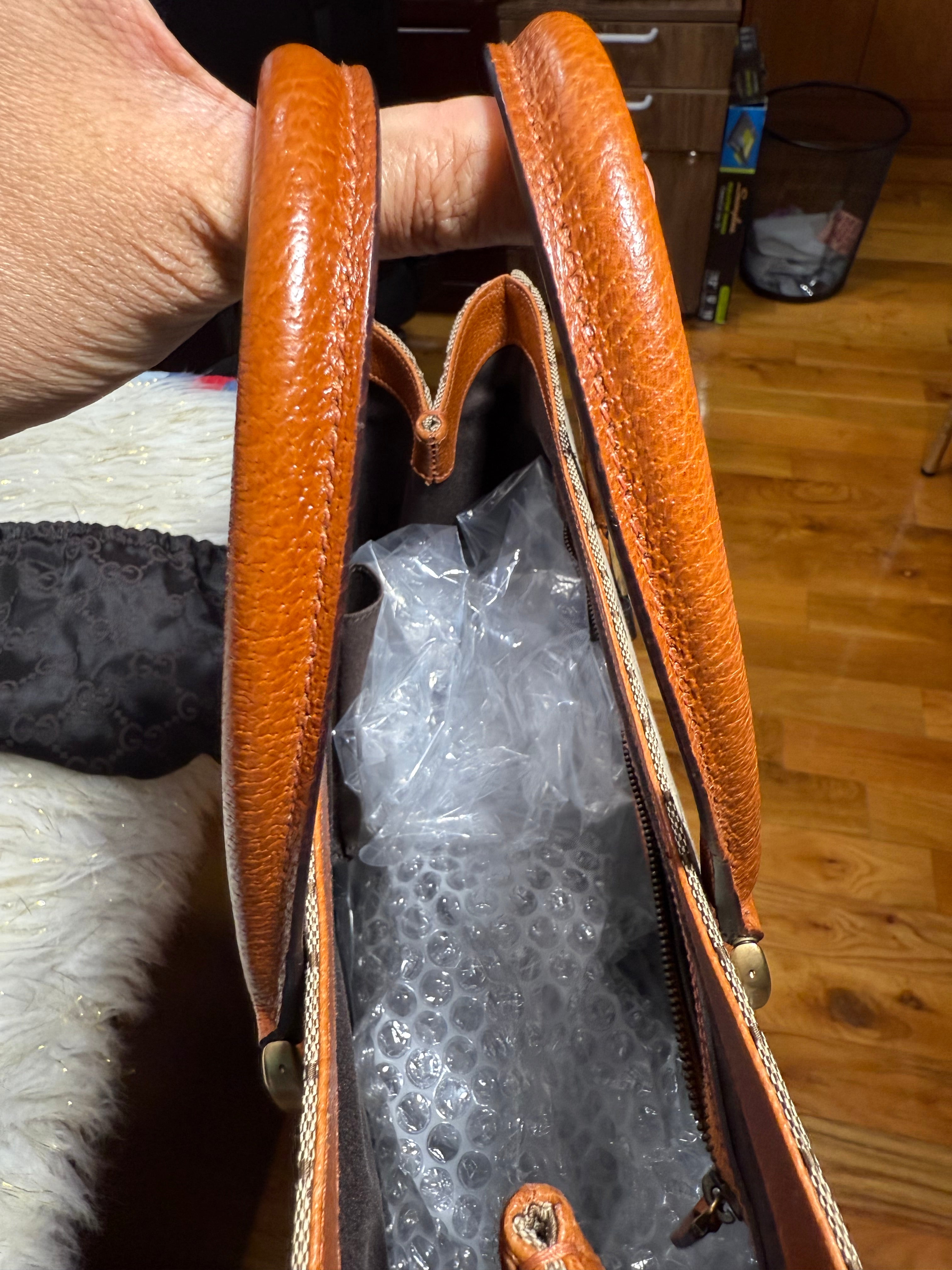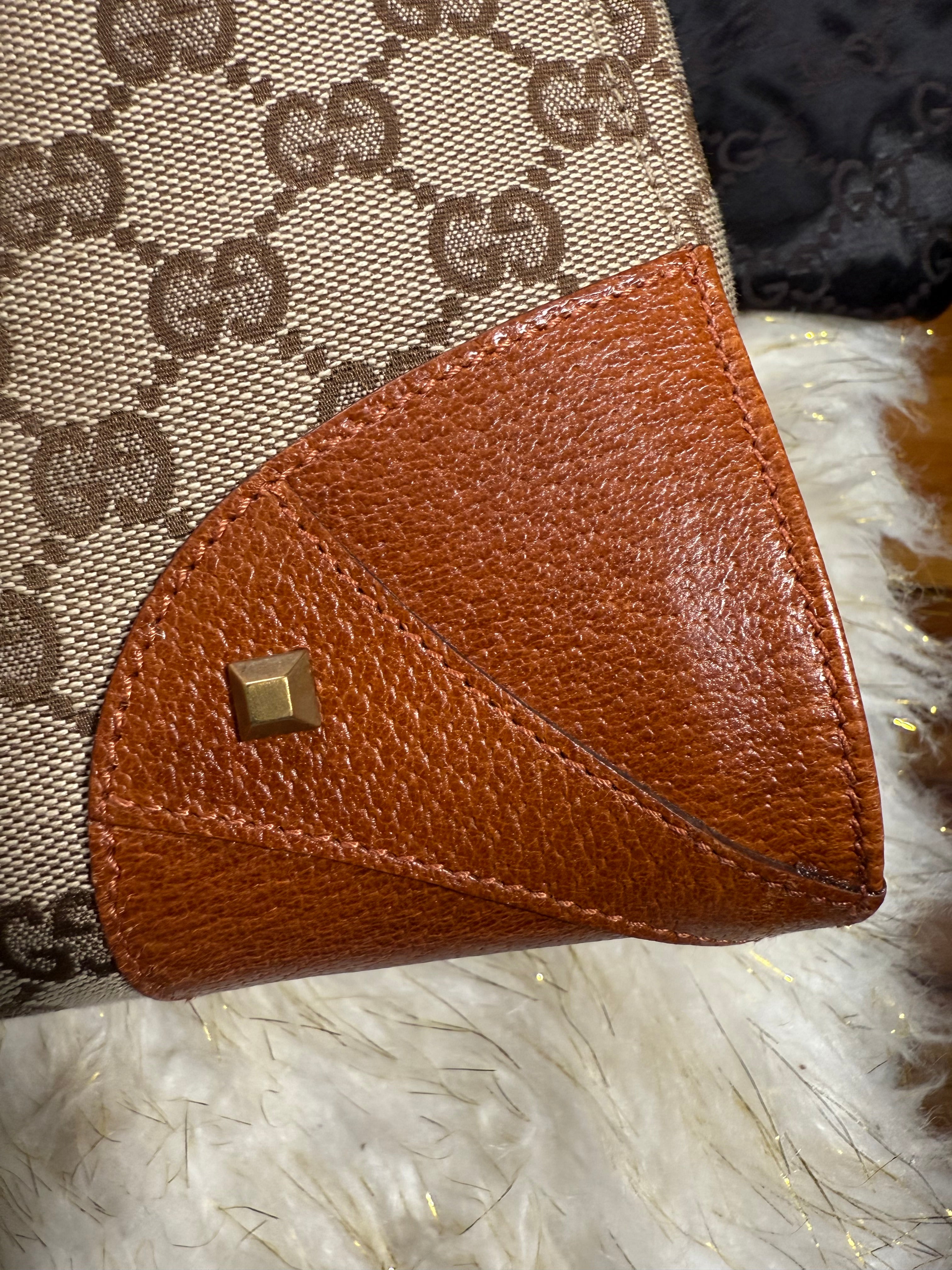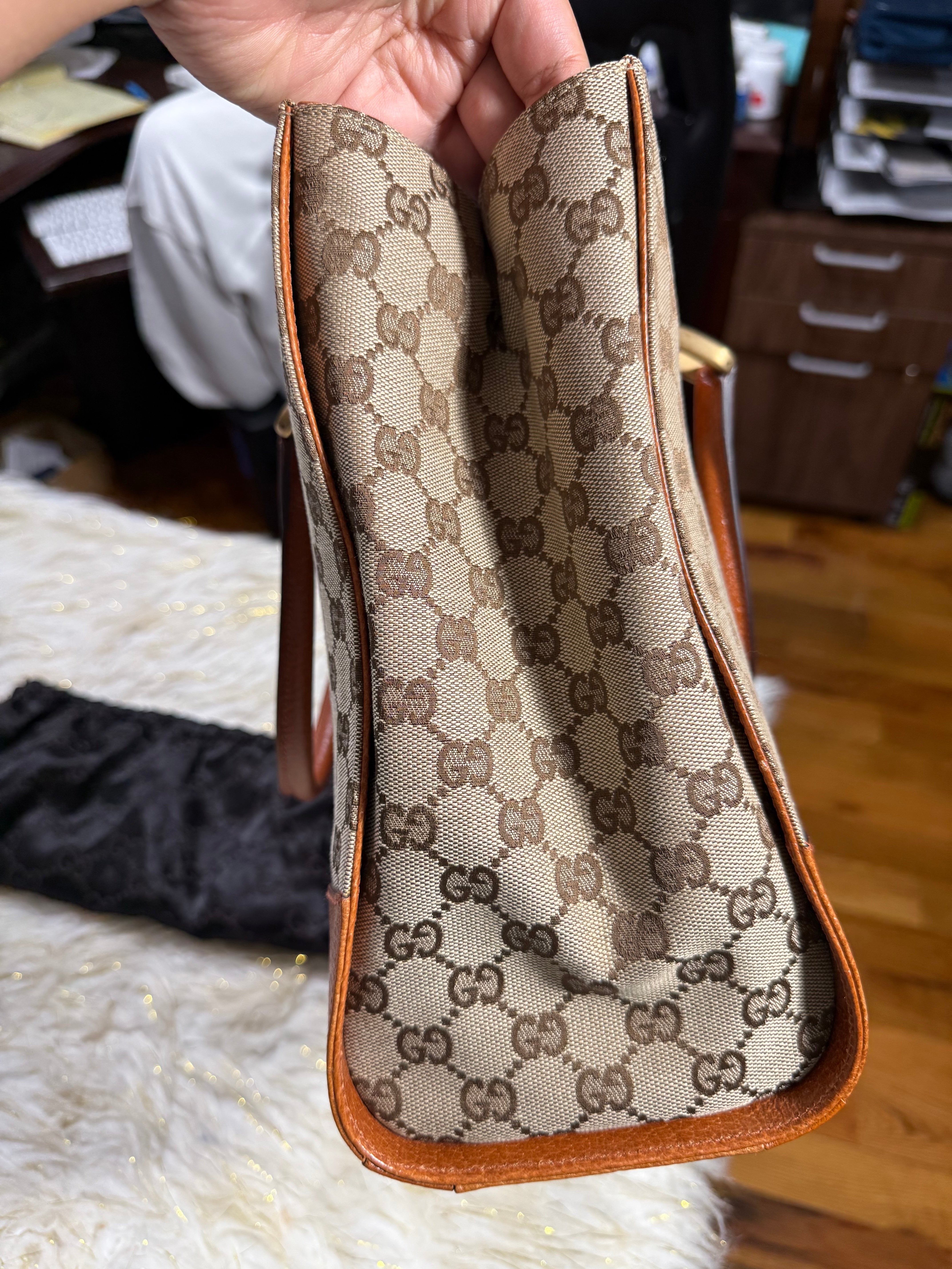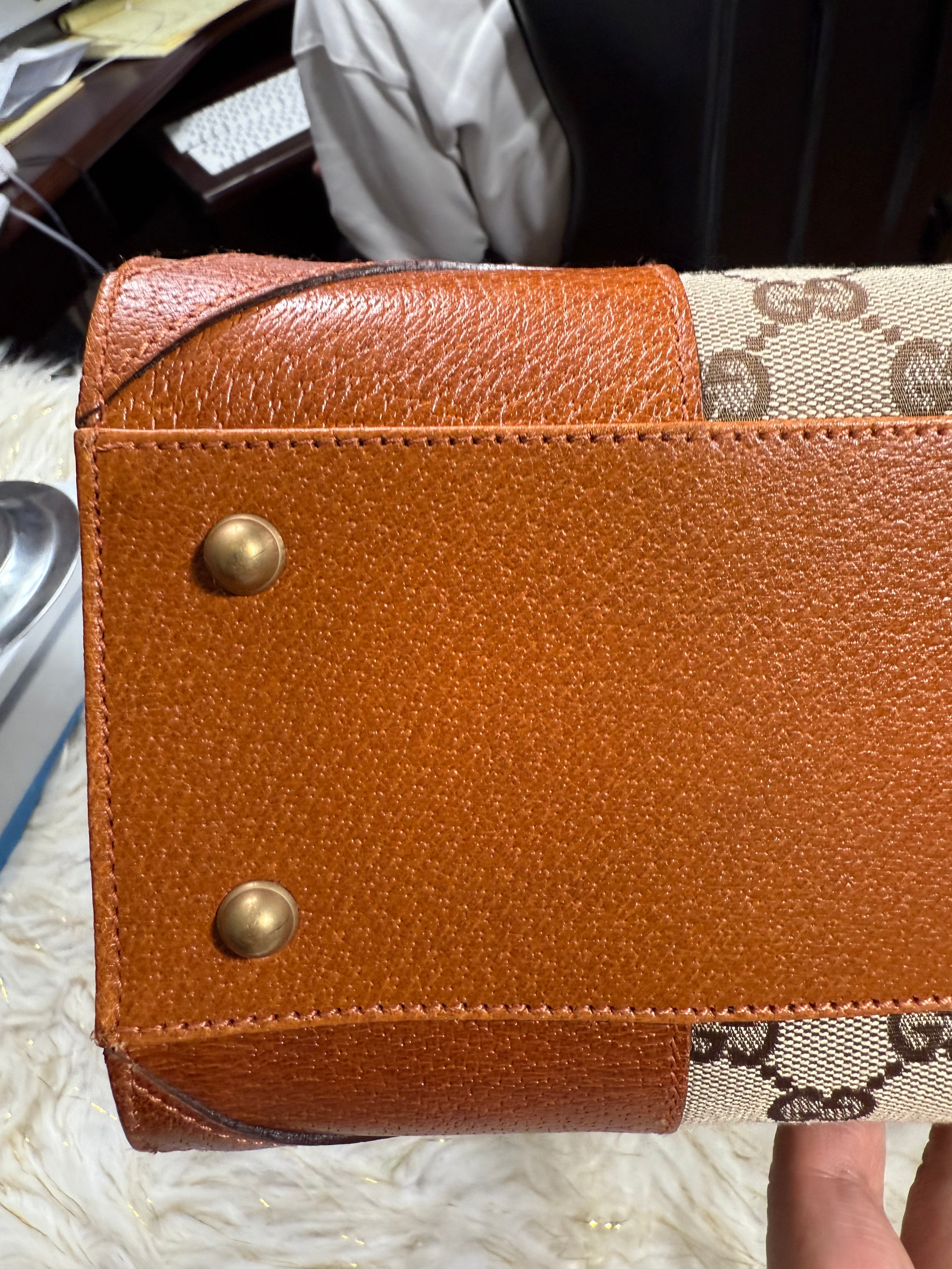 Stylish Gucci handbag with iconic monogram pattern. Features brown leather accents and tan canvas.