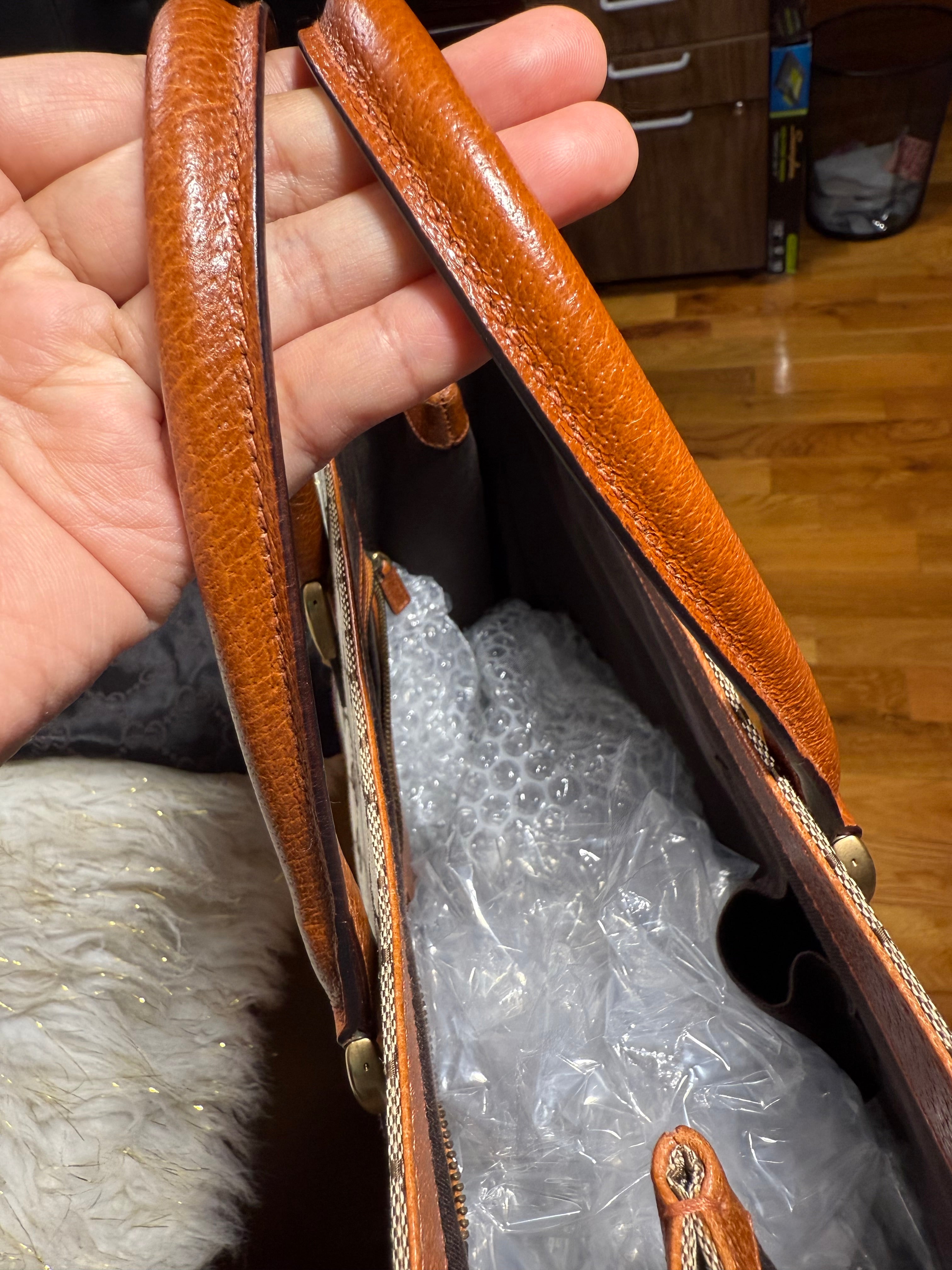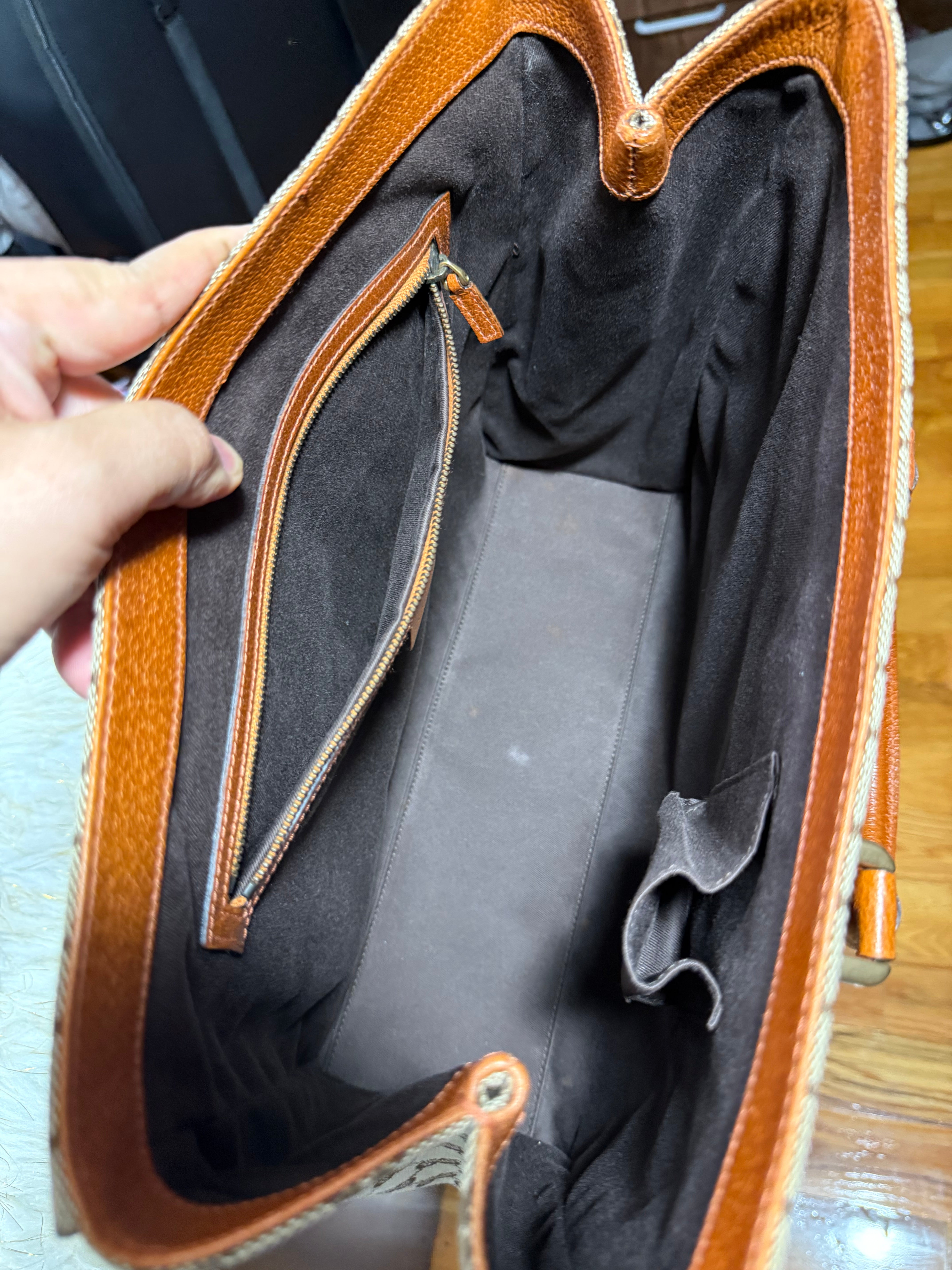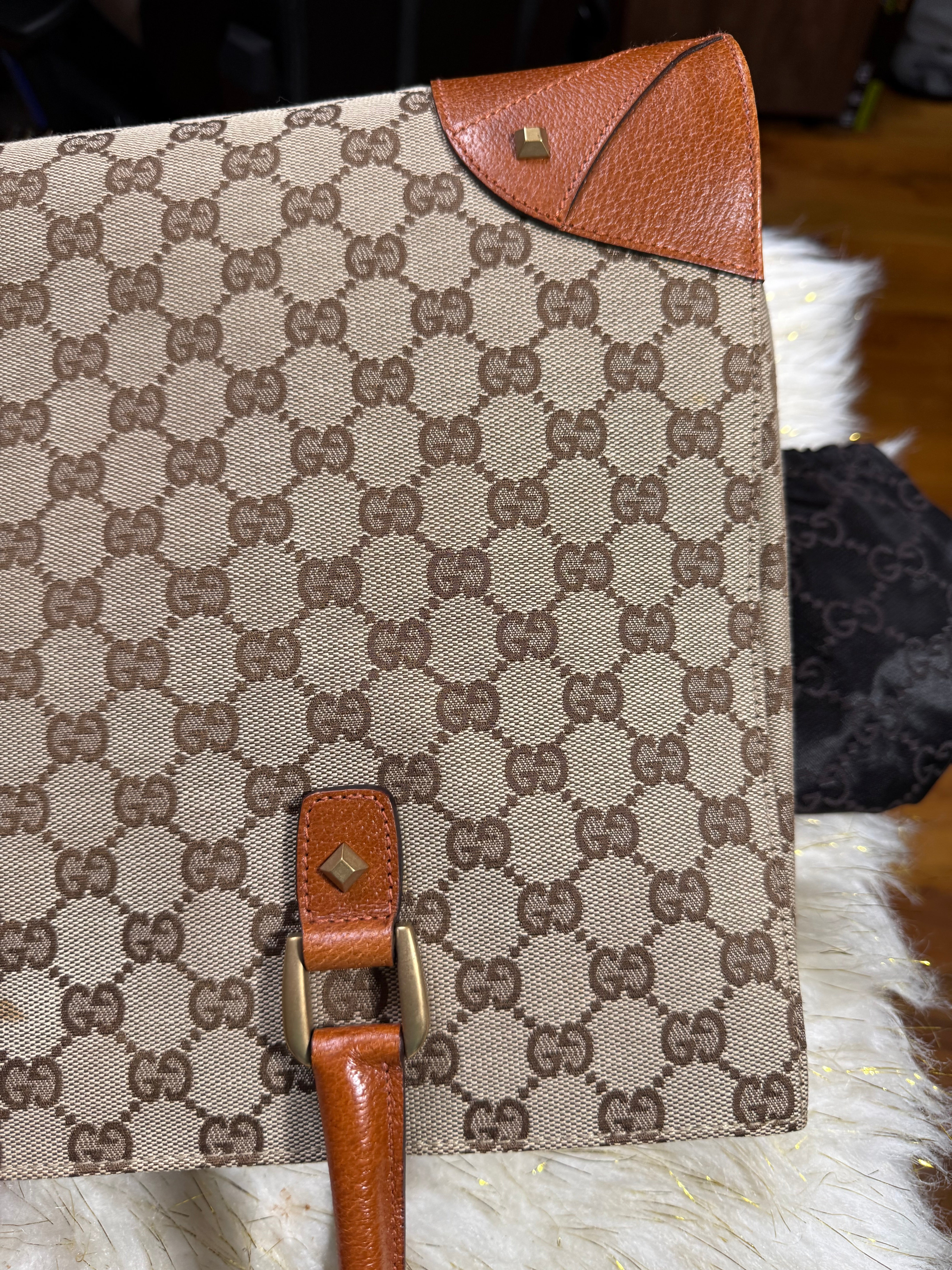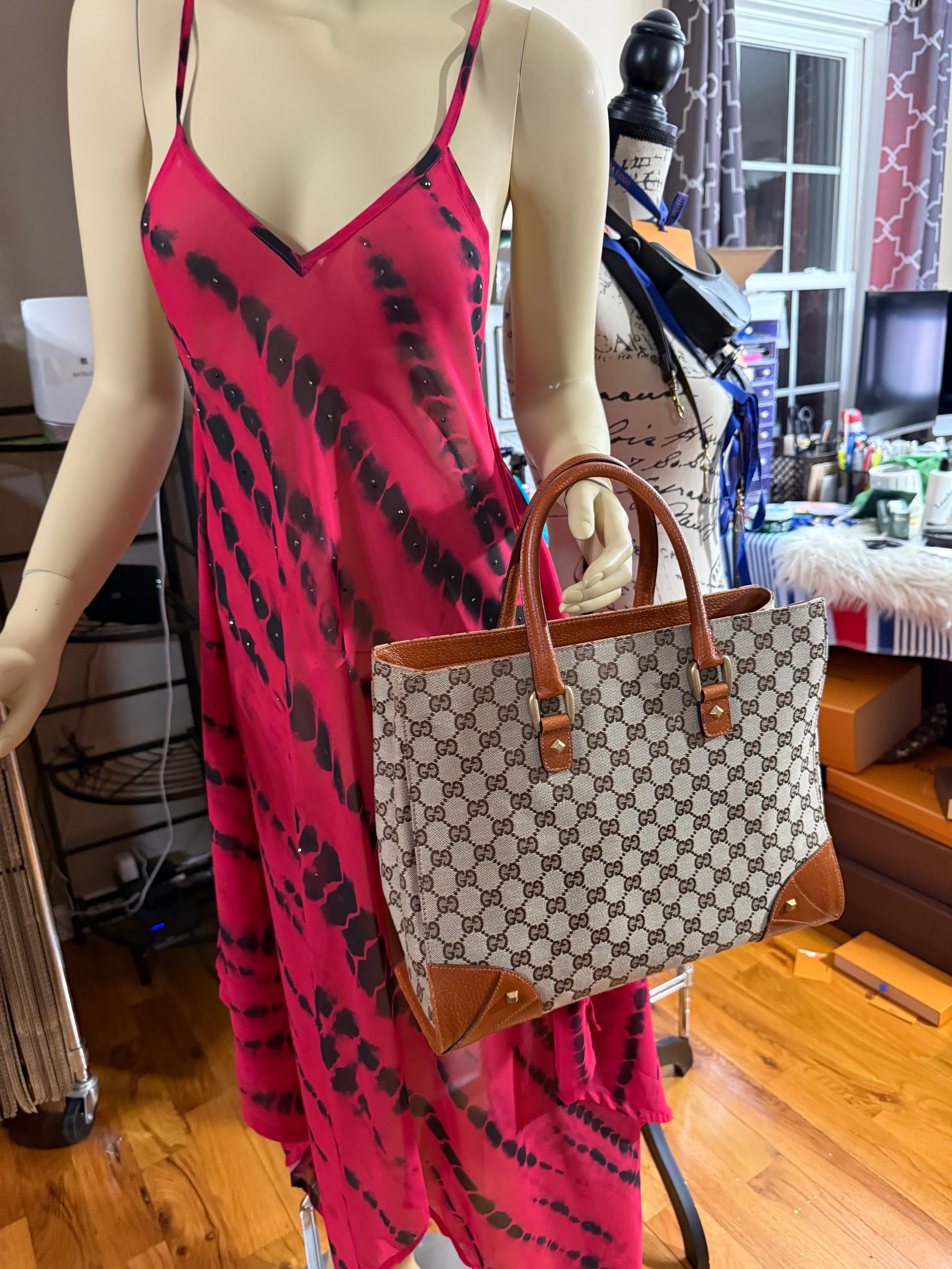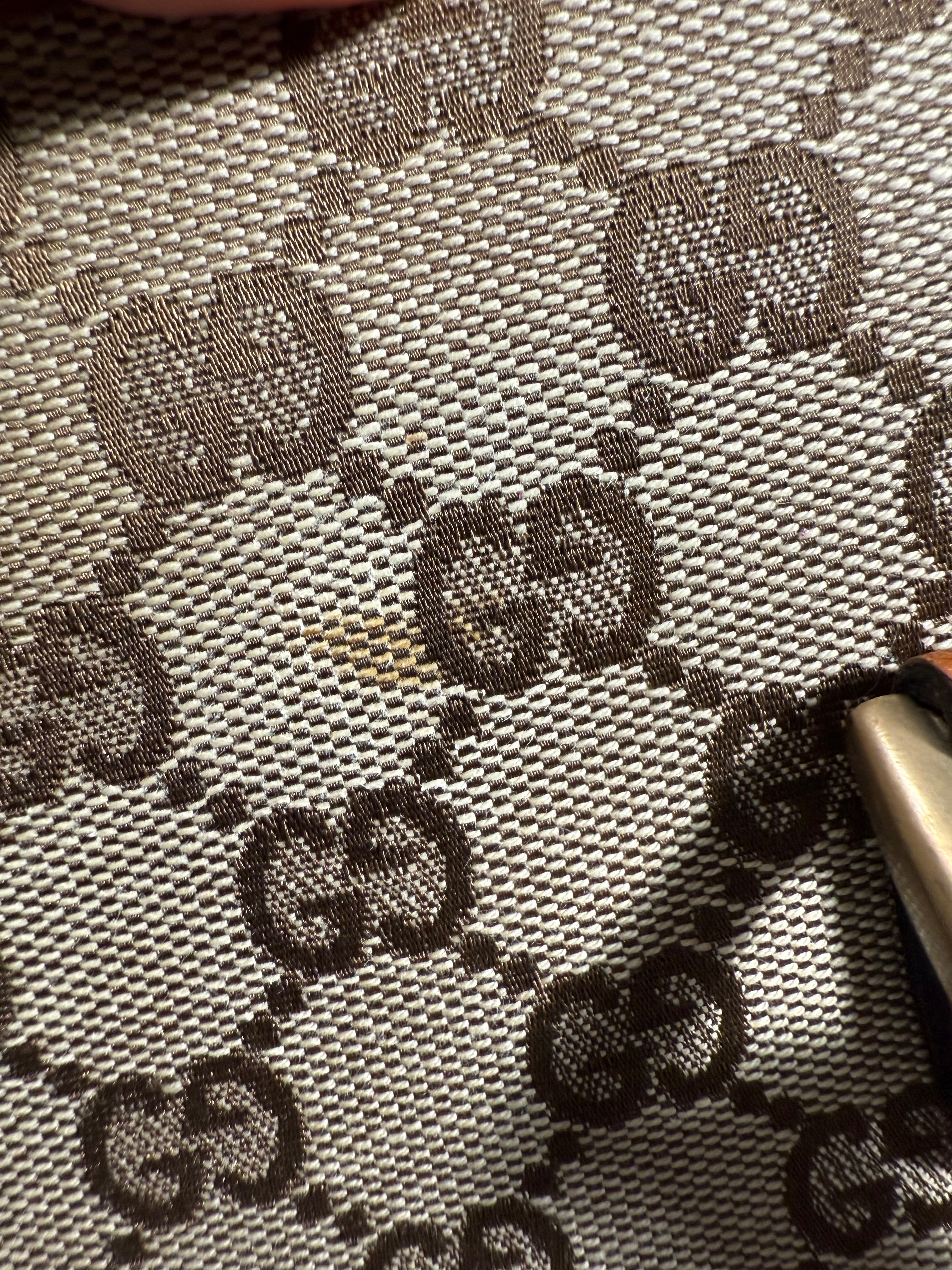 Stylish Gucci handbag with iconic monogram pattern. Features brown leather accents and tan canvas.